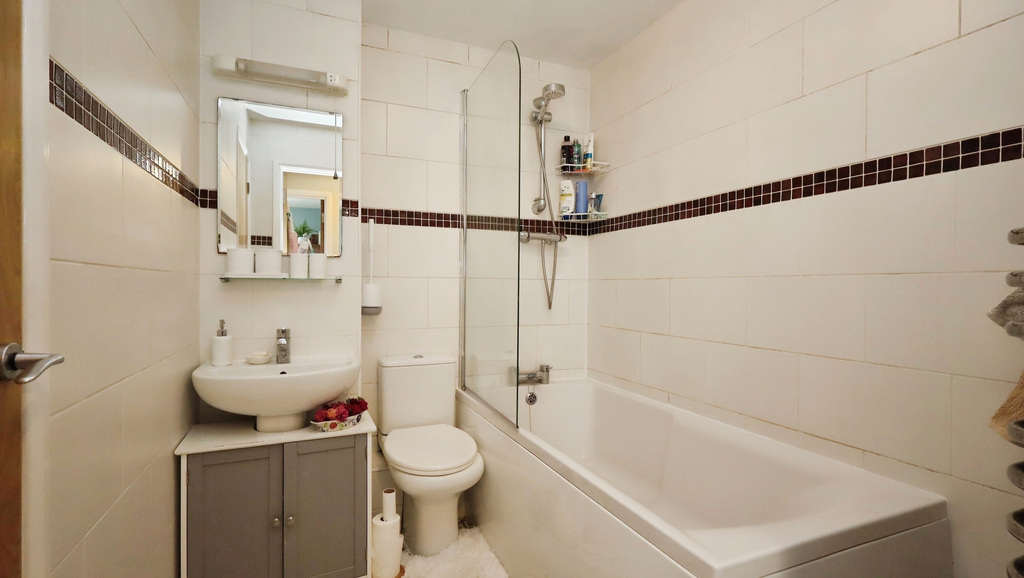 - The bathroom includes a panel bath with shower over wash, handbasin, toilet, and heated towel rail. From here there is a convenient airing cupboard with space and plumbing for a washing machine.