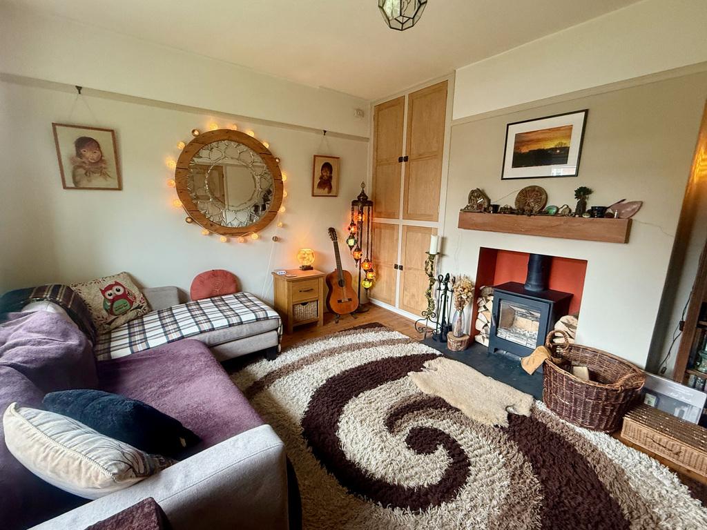 - Sitting room with woodburning stove, oak beam mantel, fitted recess cupboards and a front-facing window.