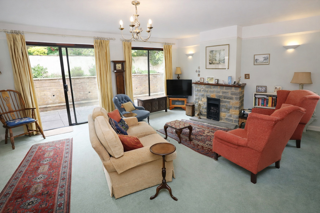 - Sitting room with feature stone fireplace and patio doors opening onto the rear terrace, creating a natural connection to the garden