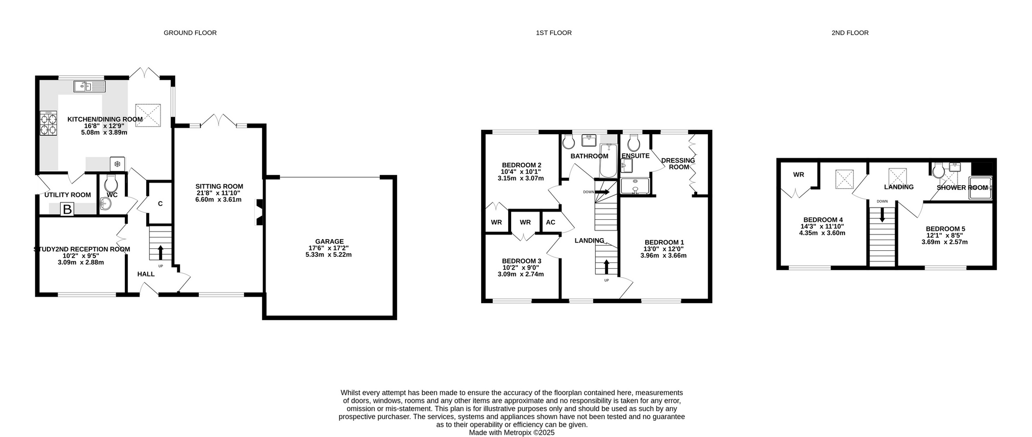 - Principal bedroom with dressing area and en-suite, two further first floor bedrooms with wardrobes, plus a top floor with two bedrooms and shower room