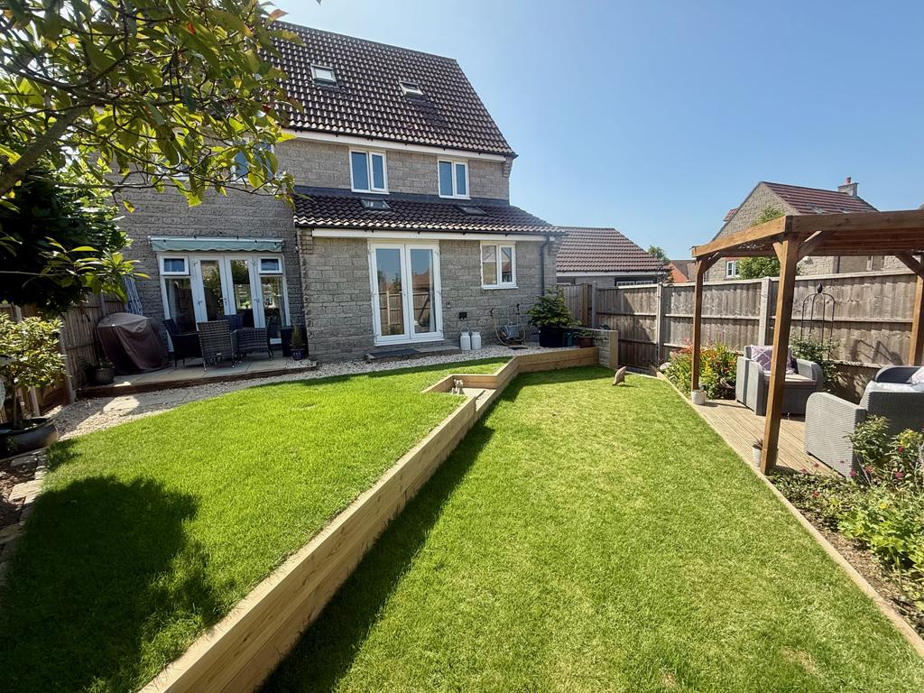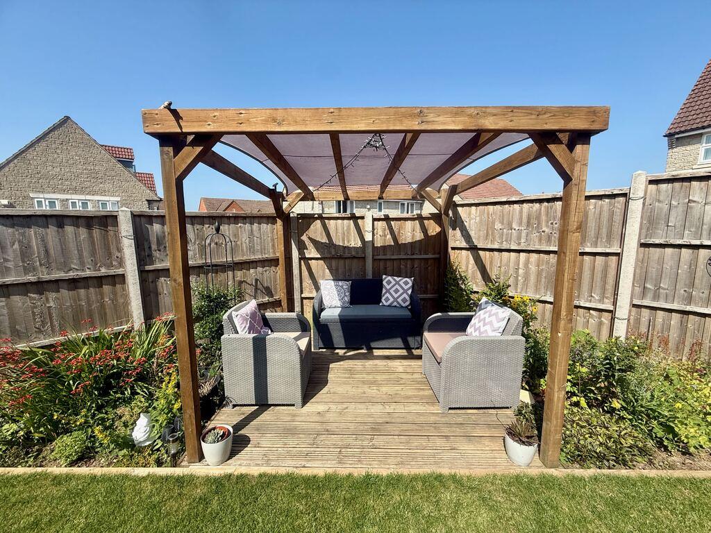 - Landscaped rear garden arranged to capture sunlight through the day, featuring a pergola-covered deck, patio area and mature shrub borders