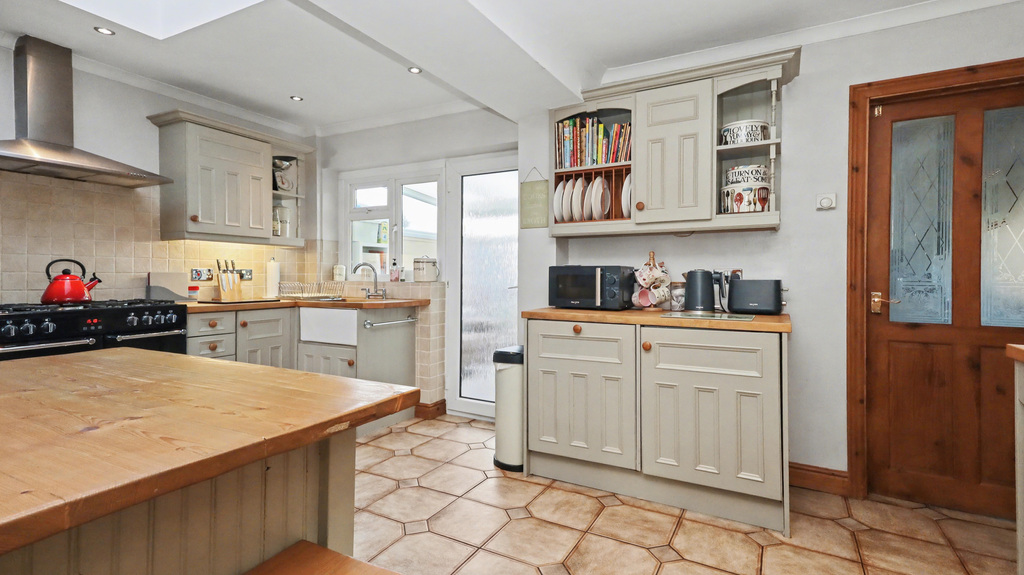 - Extended kitchen fitted with handmade painted units, wooden work surfaces, Butler sink and space for a range cooker