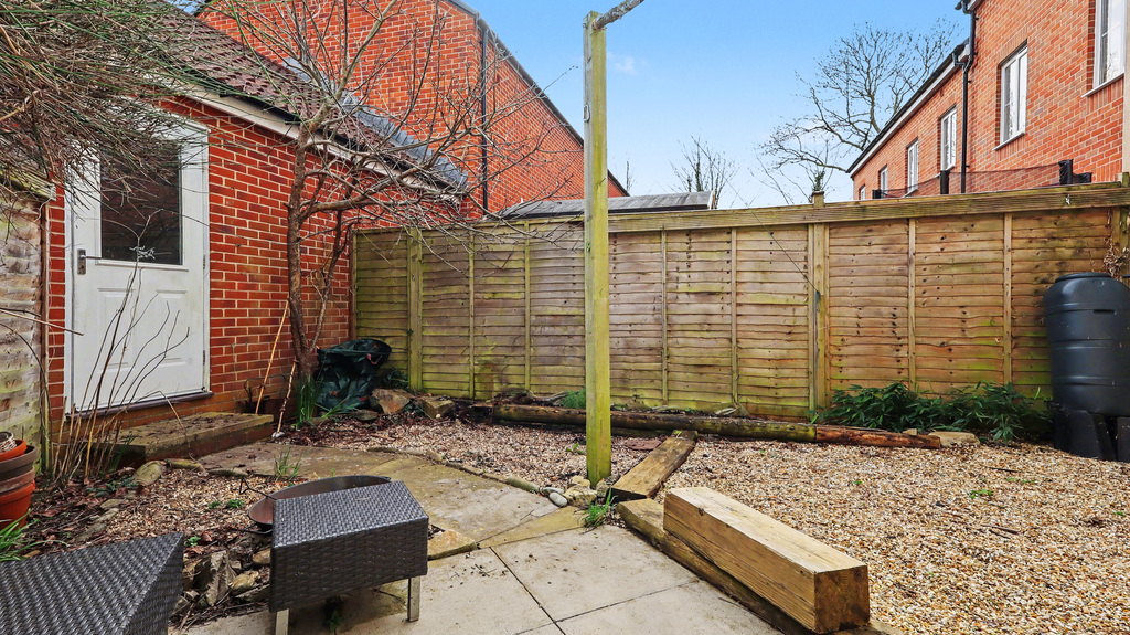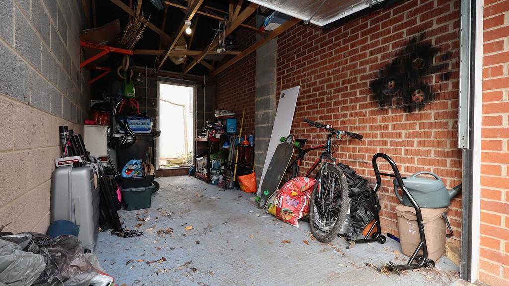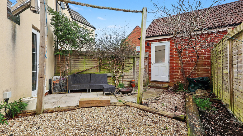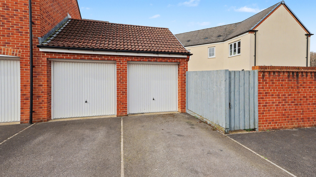 - A patio area adjoins the property, while a personal door allows access into the single garage, in front of which is a single parking space.