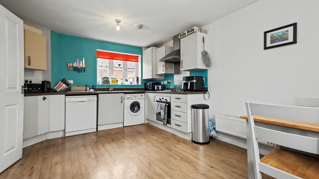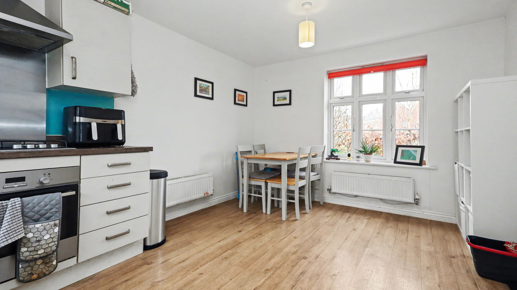 - The kitchen diner has been fitted with a mix of wall and base units with integrated electric oven and gas hob.