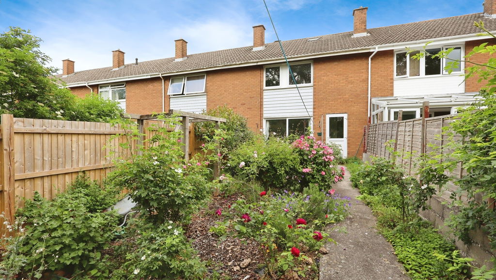 - The enclosed, west-facing rear garden is abundant with mature plants, with a path leading to a wooden gate providing access to a public green area and play park at the rear.