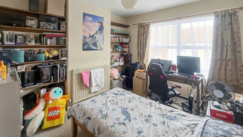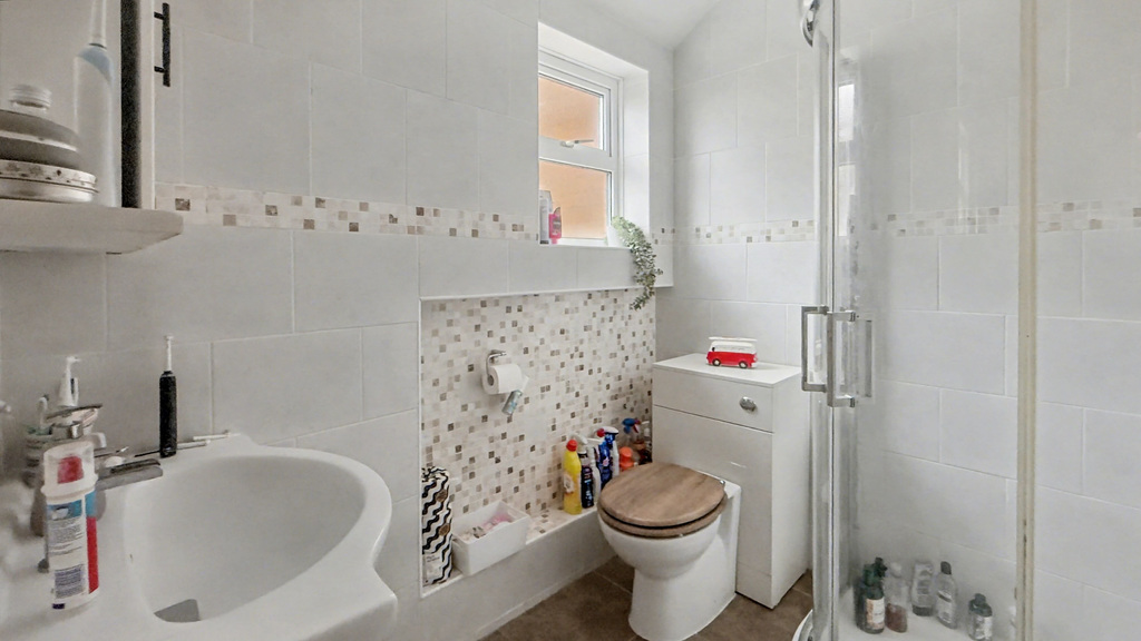 - Updated family bathroom with corner shower and fitted vanity unit.