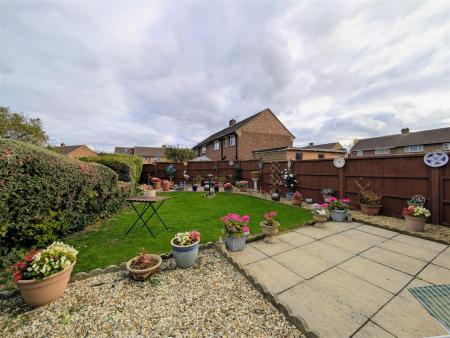 The rear garden has a paved patio, a lawn and a gravelled border with fencing and hedgerow surround.