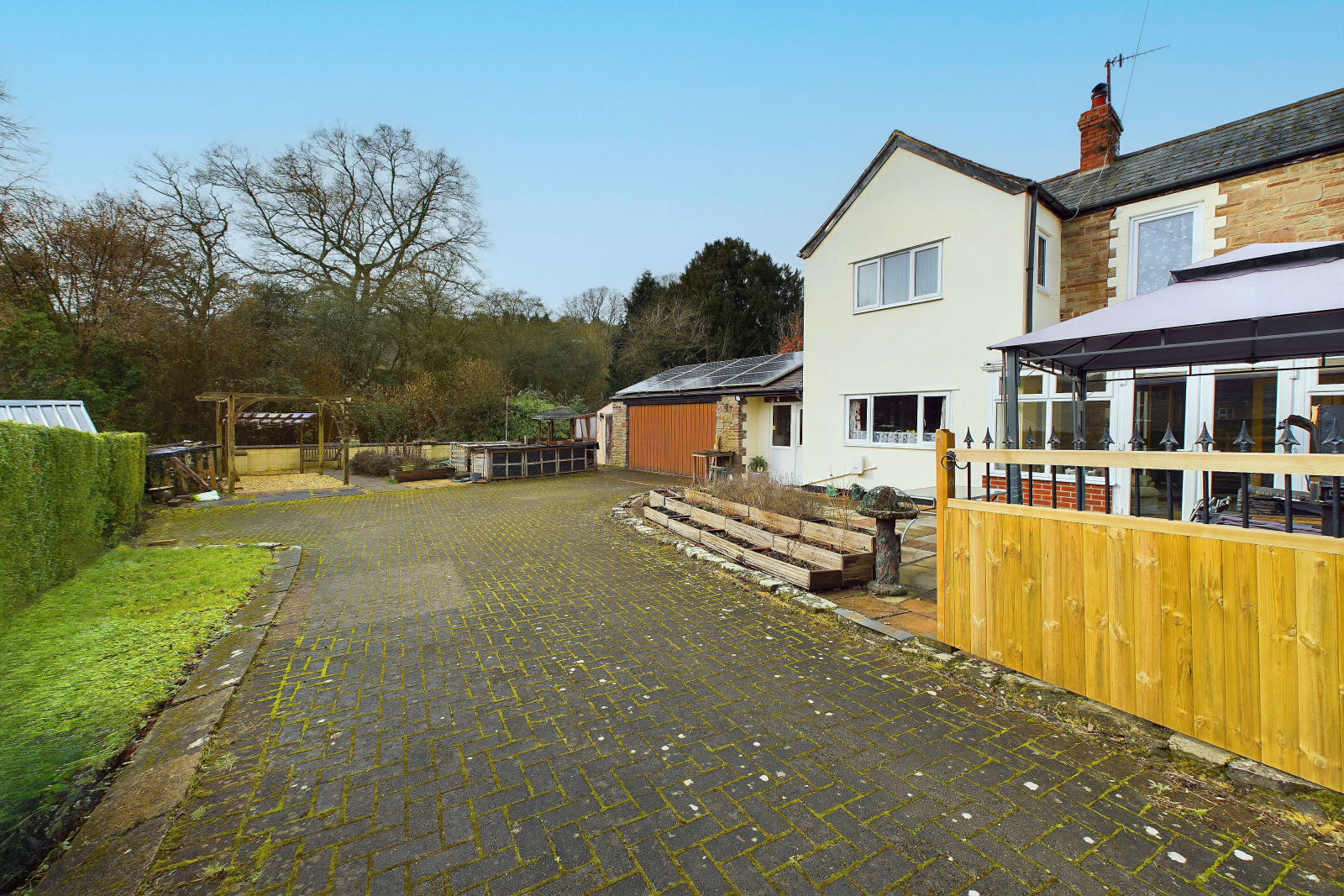 Garden & Exterior The beautifully landscaped garden is designed for easy maintenance and features a spacious block-paved driveway, providing ample parking for multiple vehicles. Charming raised flower bed and neatly trimmed hedged boundaries add character, while bespoke wooden gates offer access to the driveway. A generously sized paved patio provides the perfect spot to relax outdoors and take in the stunning scenery.