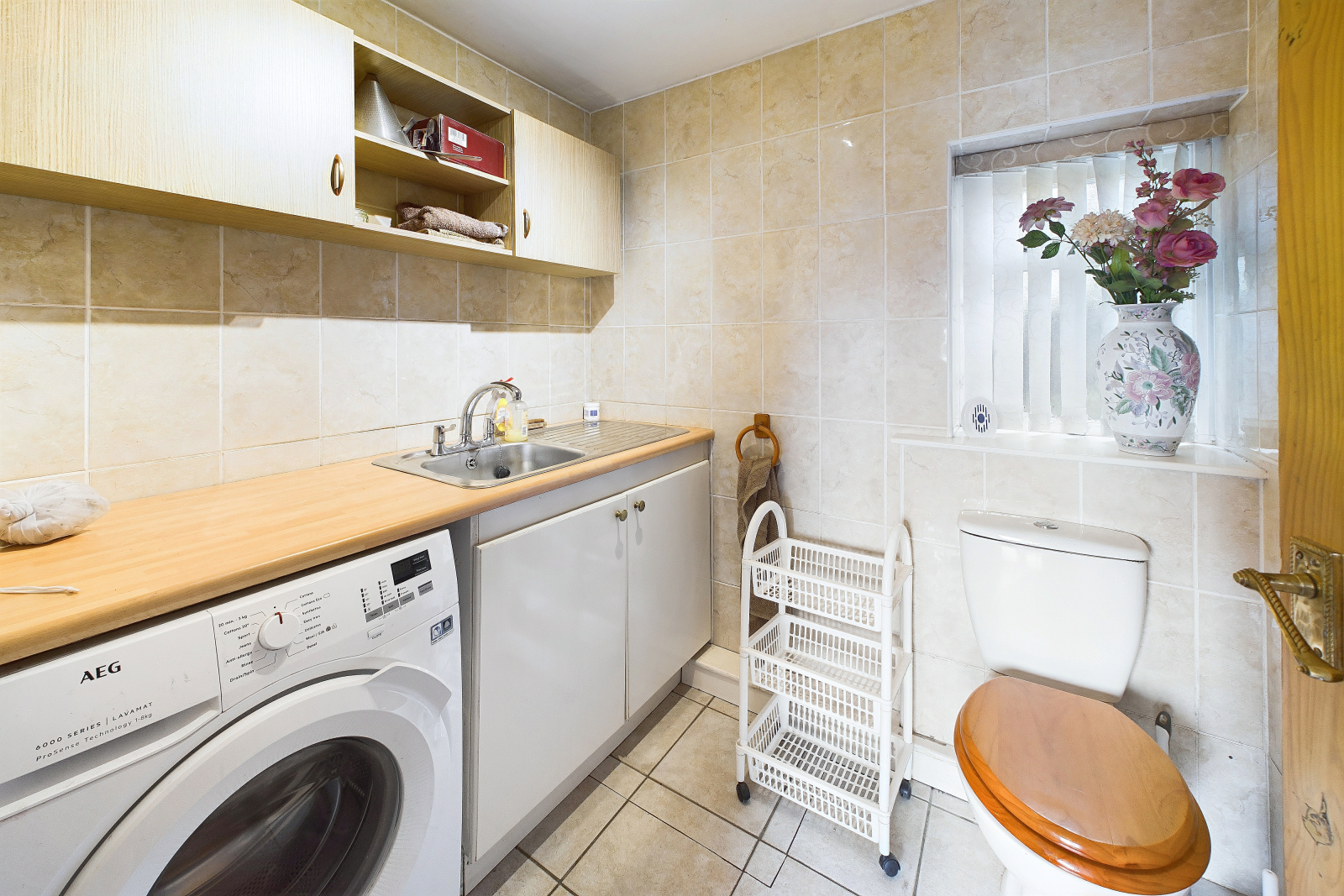 Utility Room & Downstairs W.C. - 5'8" x 6'7" (1.74 x 2.01 m) Obscured UPVC double-glazed window to the rear. Fitted with a low-level push-button W.C. and a practical selection of base and eye-level units with a rolled-top work surface. Stainless steel sink and drainer, with space and plumbing for a washing machine. Fully tiled walls, tiled flooring, ceiling lighting, and a radiator.