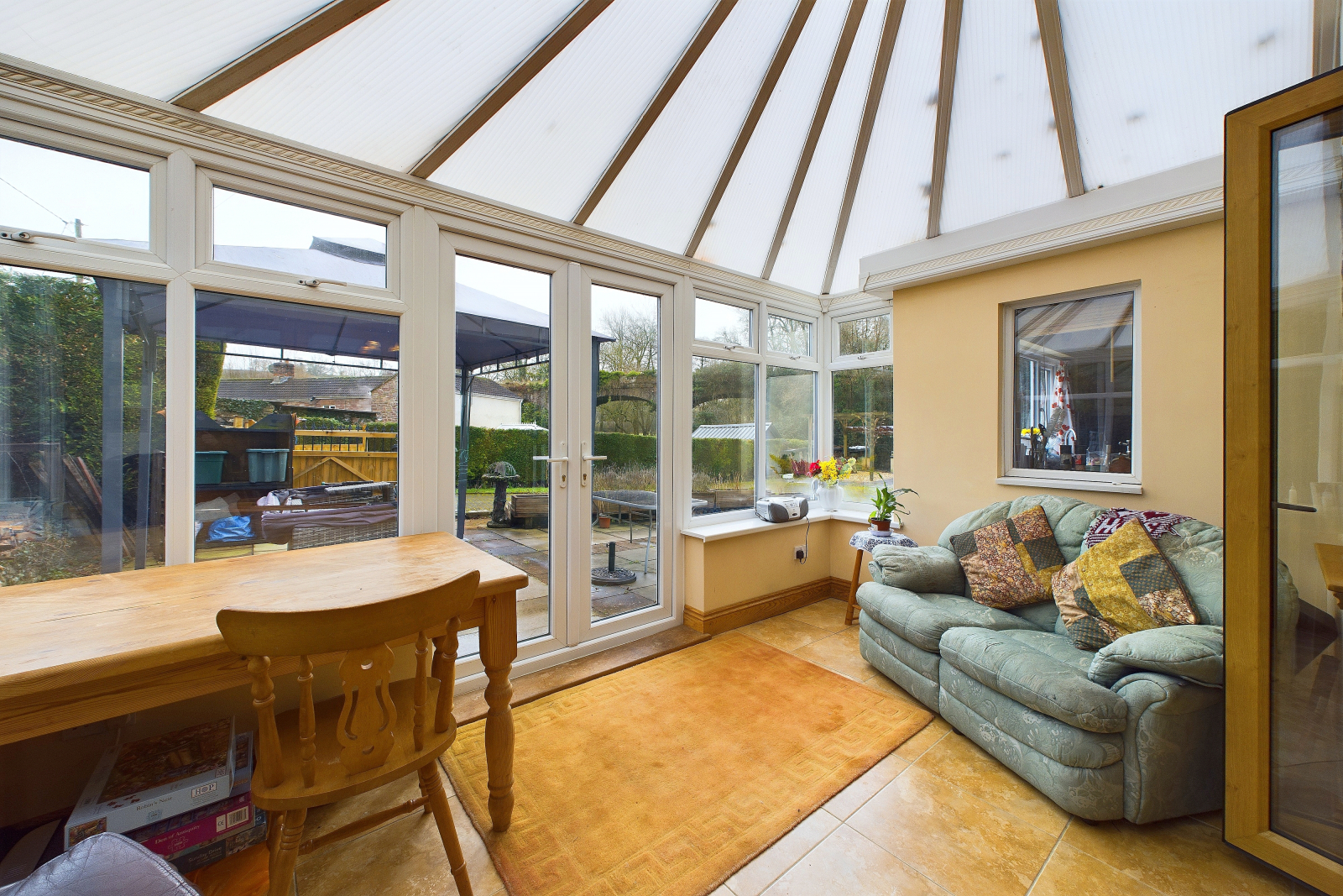 Conservatory - 7'9" x 13'6" (2.37 x 4.12 m) An exceptionally spacious room with UPVC windows and patio doors leading out to the garden. The space features tiled flooring, multiple power points, and a striking exposed stone wall.