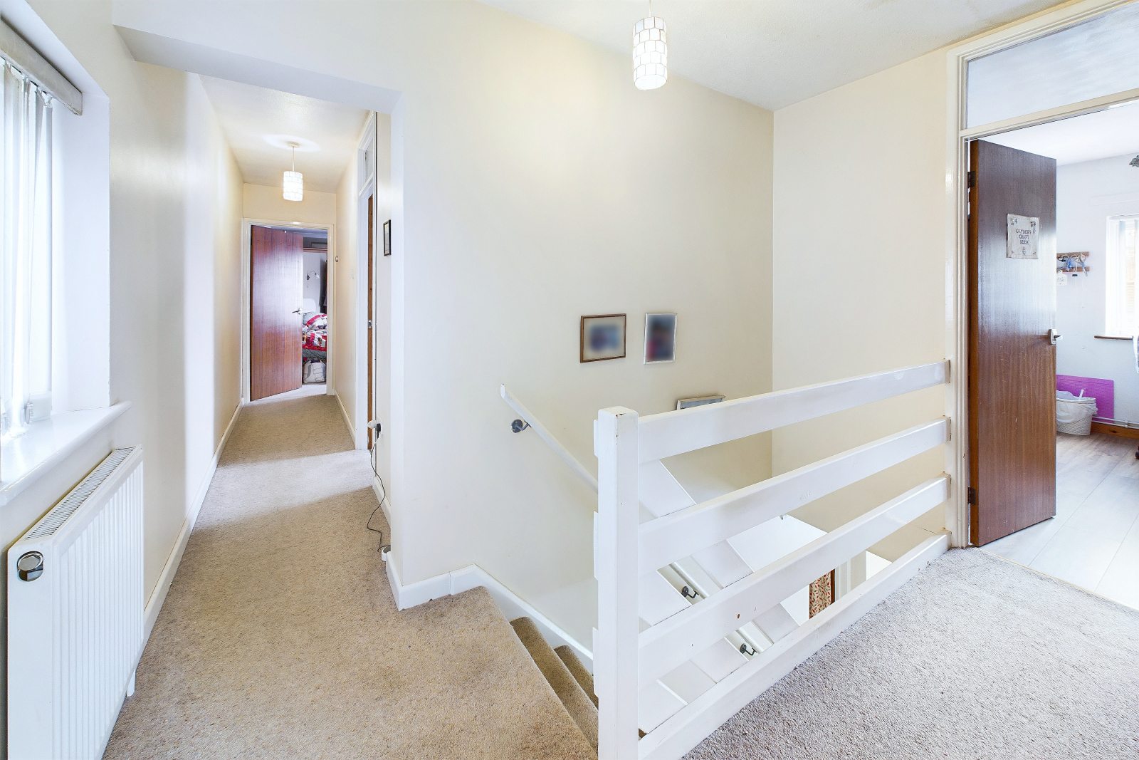 First Floor Landing A gallery-style landing with carpeted flooring throughout. An obscured UPVC double-glazed window to the rear allows natural light to filter through. Features central pendant lighting, power points, and doors leading to all bedrooms and the family bathroom. A built-in airing cupboard provides useful shelving.