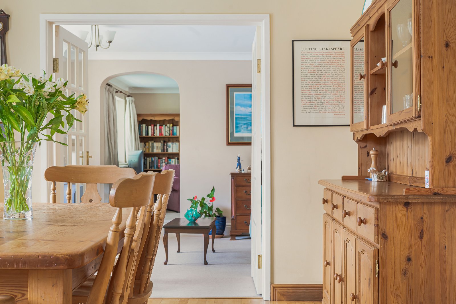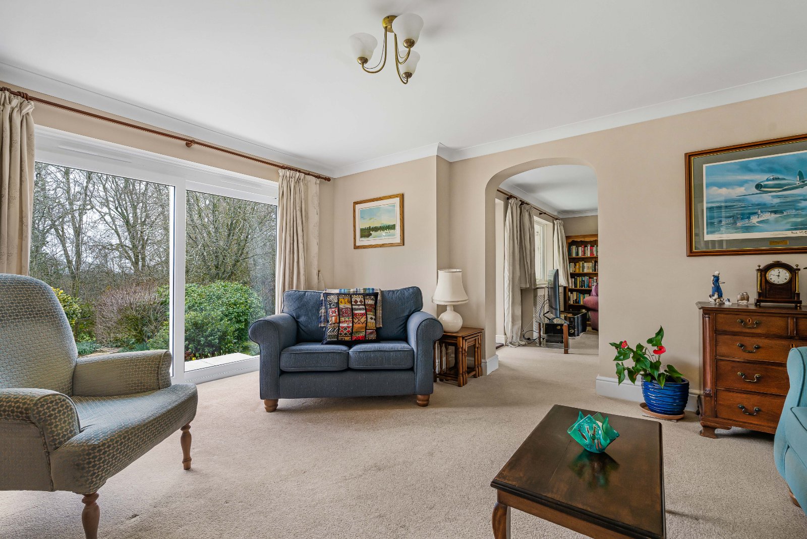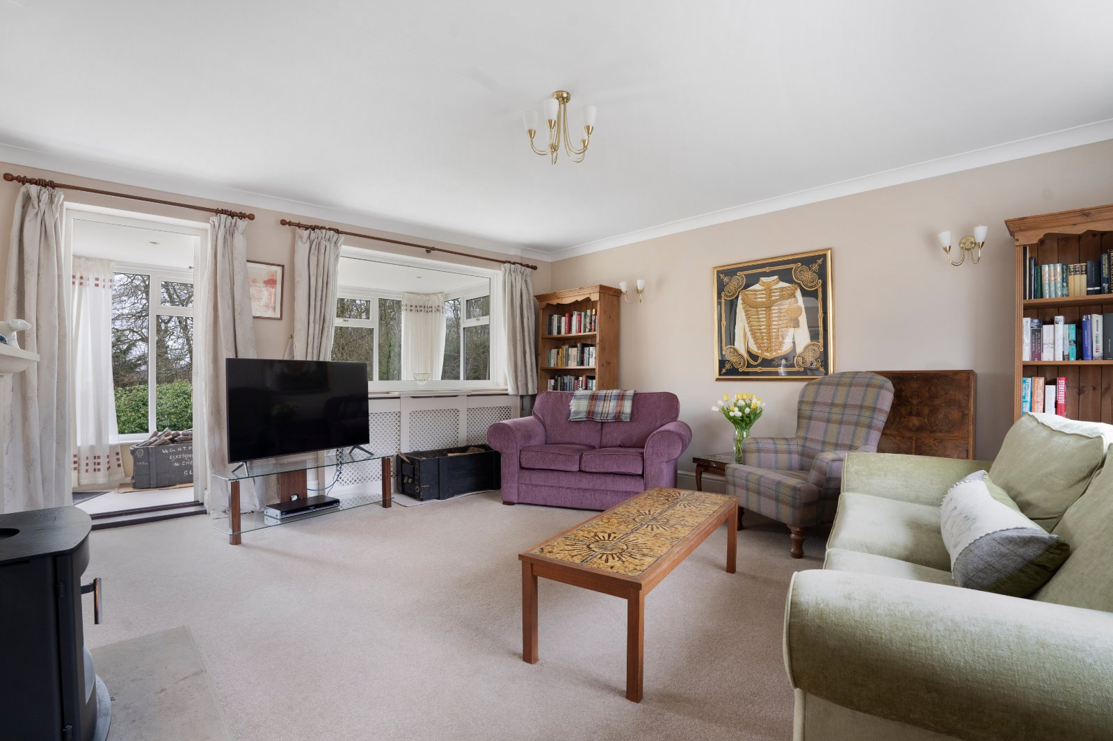 The property is approached via a welcoming reception hall with cloakroom/WC, leading through to the principal reception rooms. The sitting room is an impressive dual-aspect space measuring over 26 ft in length, with sliding glass doors onto the terrace. It provides an exceptional and bright principal reception area with ample room for formal seating and entertaining. A centrally positioned log-burning stove creates a natural focal point and efficiently heats this superb living space.