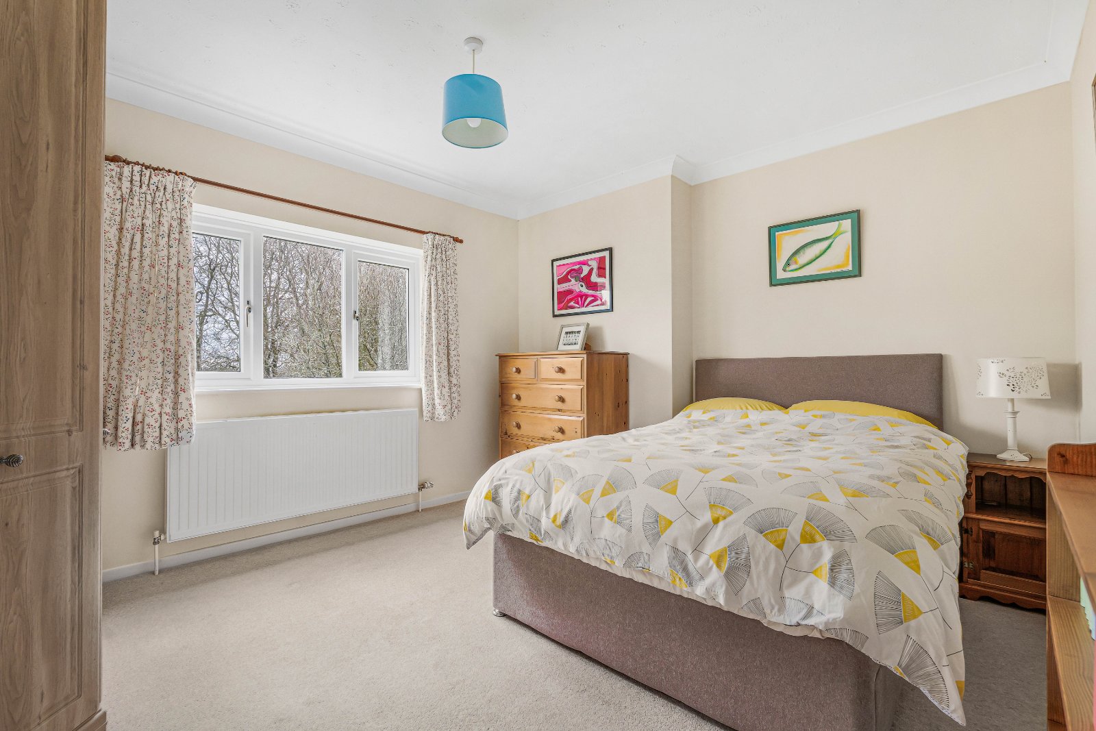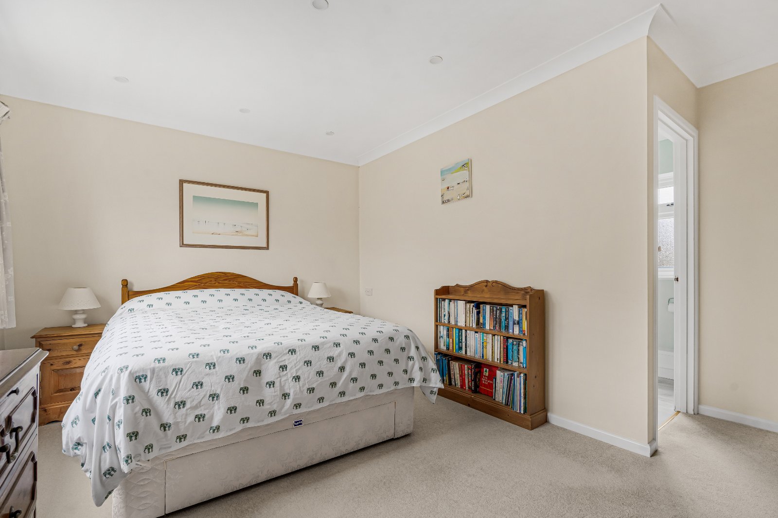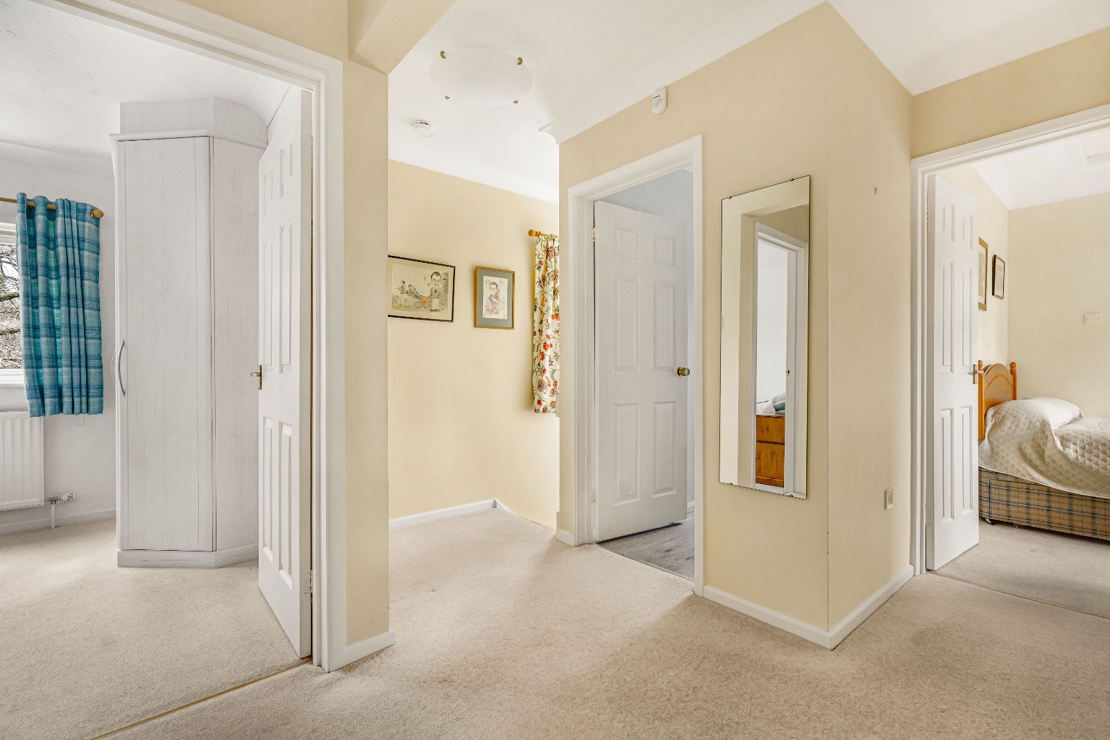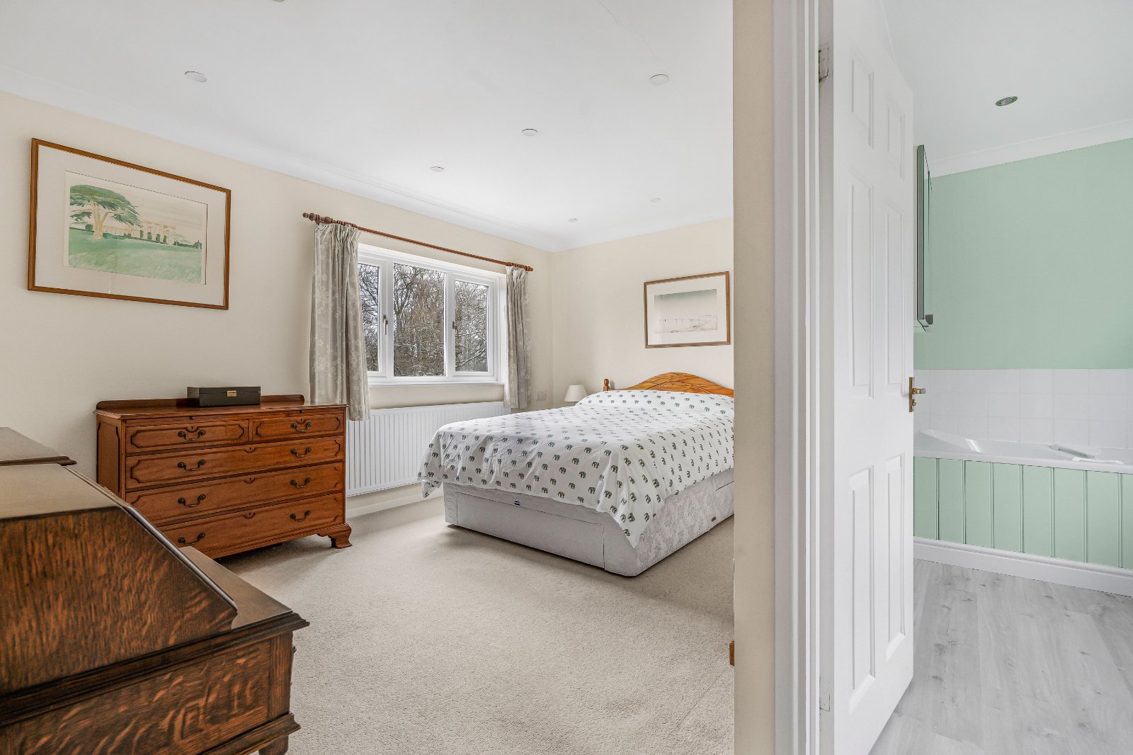 On the first floor, a central landing gives access to four well-proportioned double bedrooms. The principal bedroom is approached via a walk-in dressing room with fitted wardrobes and benefits from an en-suite bathroom with separate shower. A second double bedroom also enjoys en-suite shower facilities, whilst two further bedrooms — both with built-in wardrobes — are served by a spacious family bathroom.