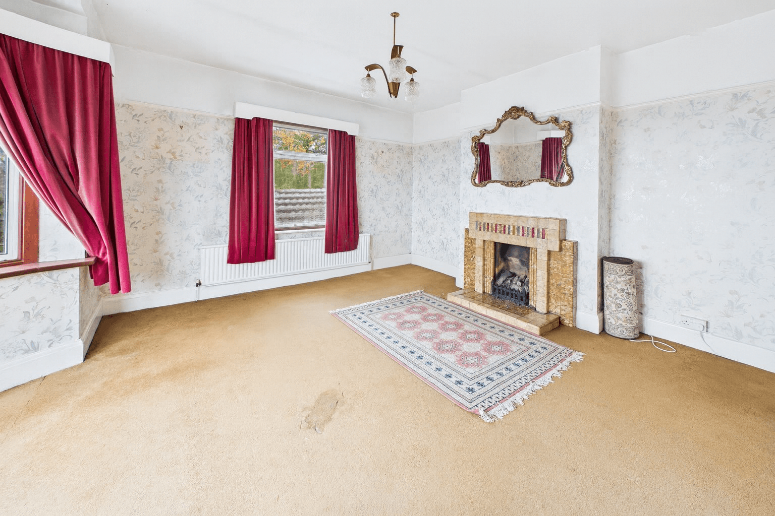 A bright and inviting room with a beautiful bay window to the front elevation, offering elevated woodland views. A further window to the side aspect enhances the natural light. The charming feature fireplace has a flame-effect fire with a tiled hearth. Carpeted throughout with a radiator, central lighting, and power points.