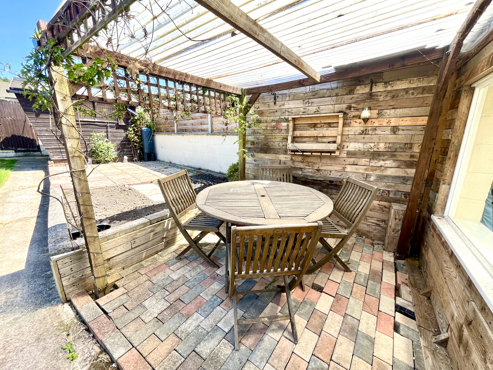 To the rear the spacious and bright garden is laid mainly to lawn with secure fenced boundaries. Having a large paved patio area and additional charming pergola with blocked paving. Raised flowering borders and a wooden summerhouse. Gated rear access to garage and driveway.