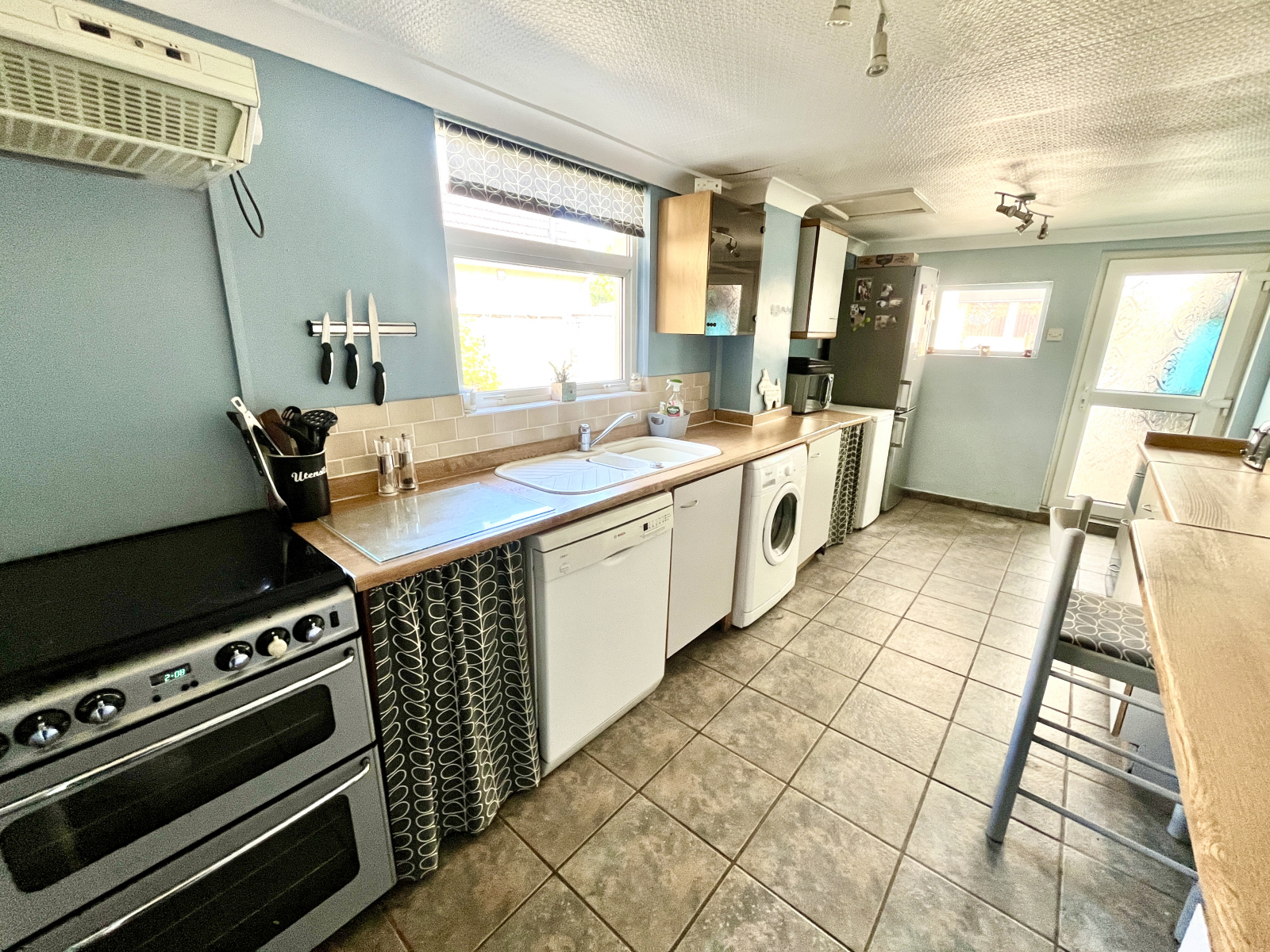 17' 5'' x 8' 0'' (5.30m x 2.44m)UPVC double-glazed window to side and rear elevation with UPVC door giving access to the rear porch. Range of base and eye level fitted units and drawers with wood effect rolled top surfaces and breakfast bar area. Space for electric oven with extractor above and plumbing for washing machine and dishwasher. Sink and drainer with mixer tap and tiled splash backs. Range of power points and tiled flooring.