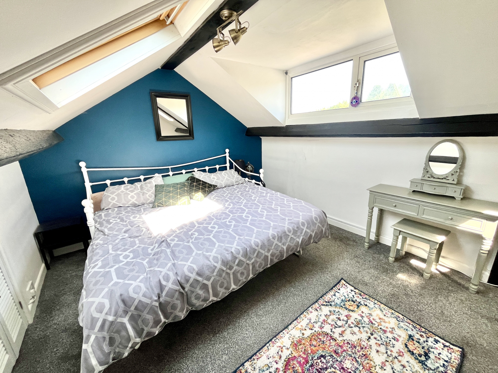 UPVC double-glazed window to rear and two skylights. Feature ceiling beams and carpeted flooring. Central lighting and radiator. Eaves storage cupboards and power points.