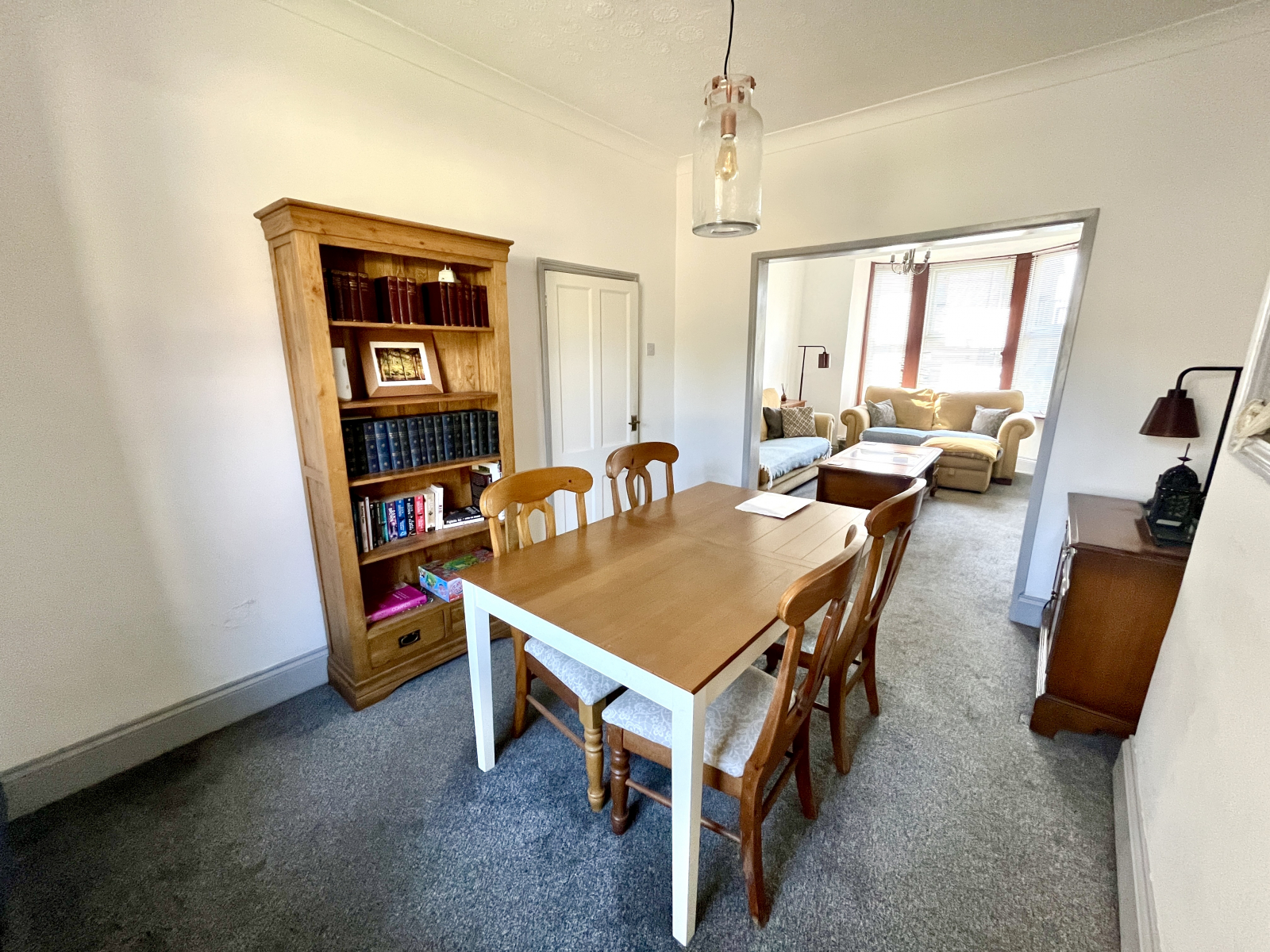UPVC double-glazed window to the rear. Carpeted with central lighting. Range of power points and modern vertical radiator. Feature alcove and space for dining table.