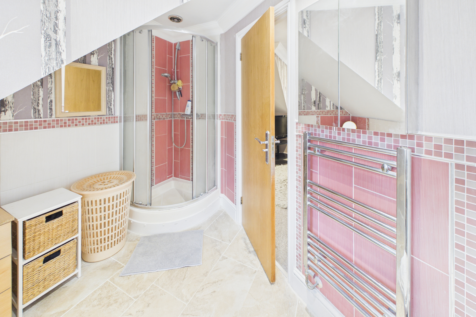 En-Suite 5'11'' x 8'2'' Featuring an obscured UPVC double-glazed window to the rear. The stylish suite includes a low-level WC, integrated wash hand basin with storage beneath and rolled-edge work surface, and a step-in corner shower with power shower and attachments. Finished with half-tiled walls, tiled flooring, spot lighting, extractor fan, and chrome heated towel rail.