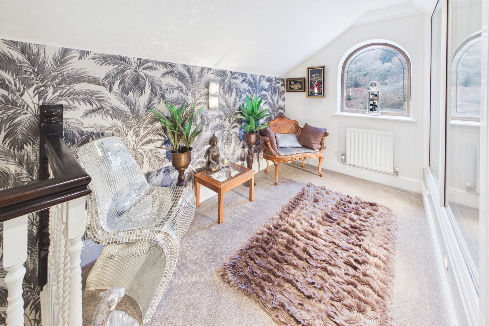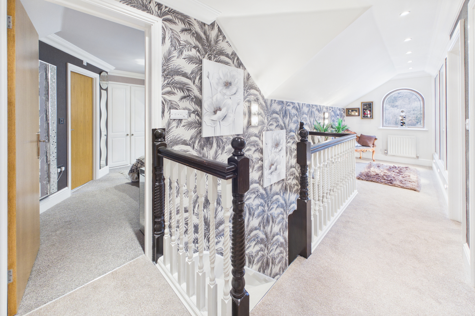 First Floor Landing 22'1'' x 6'2'' A plush carpeted, gallery-style landing offering a charming snug area with wall lighting and a UPVC double-glazed window showcasing beautiful woodland views. Spot lighting, internal feature windows, radiators, power points, and doors leading to all rooms.