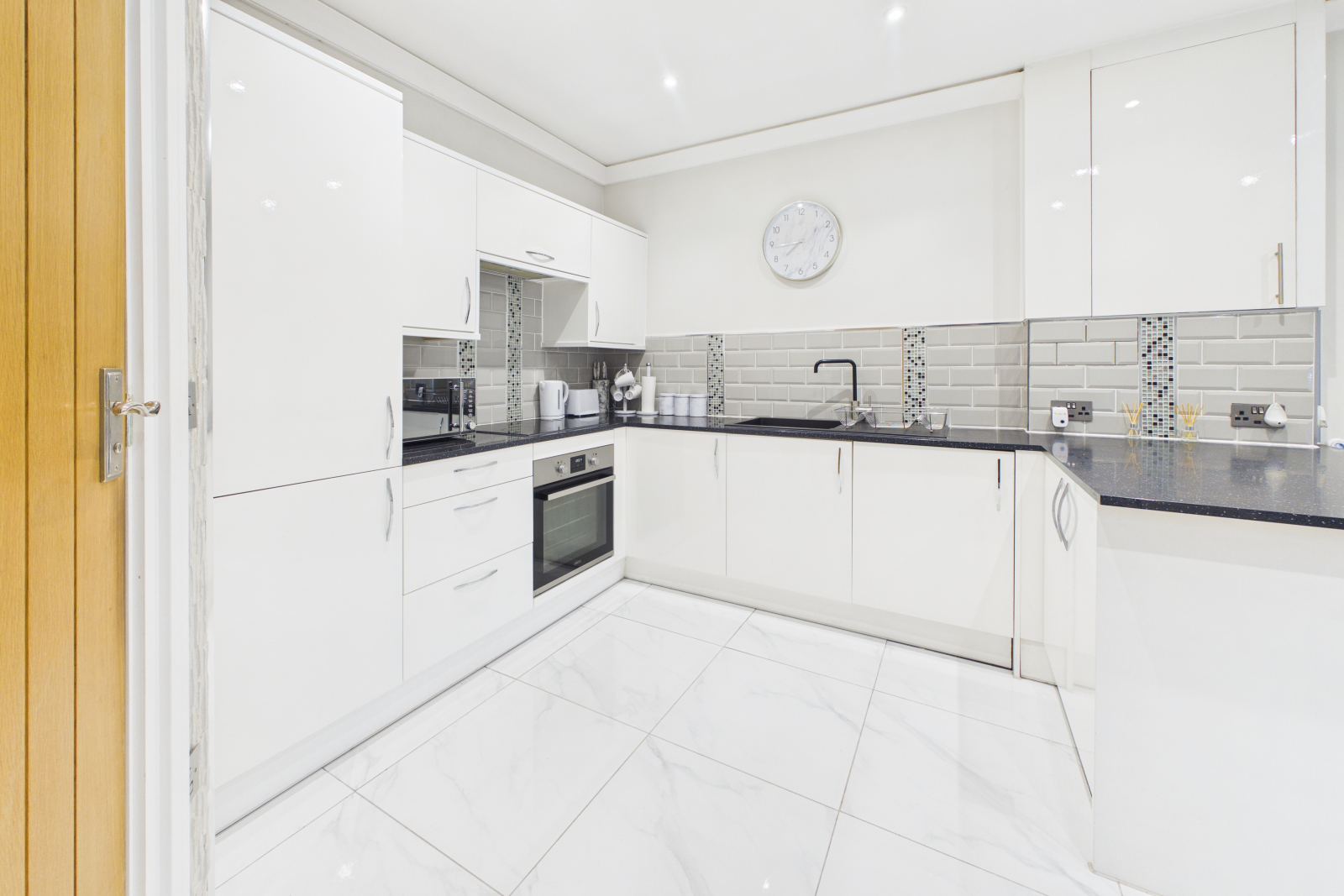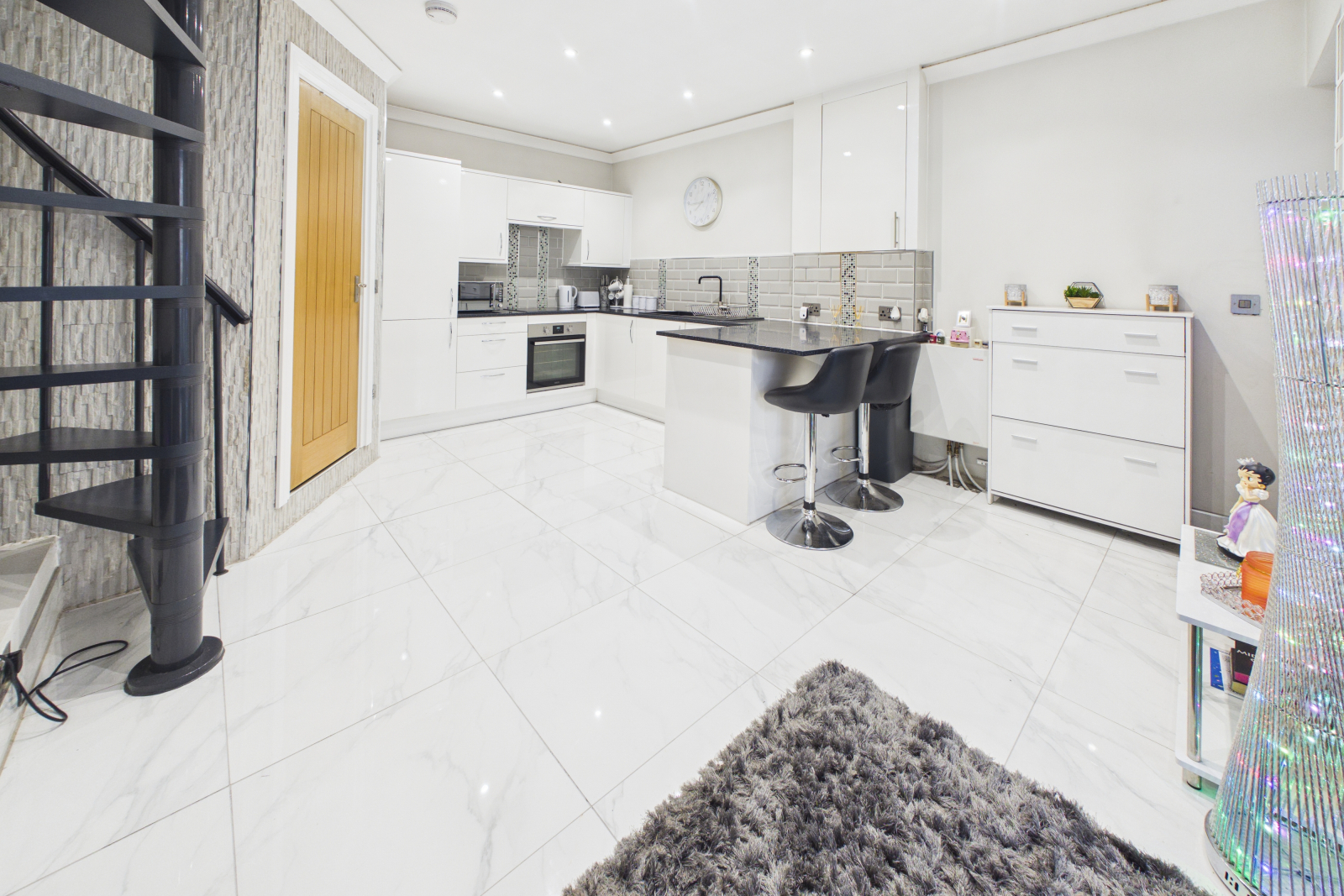 Accessed via a UPVC double-glazed entrance door and UPVC patio doors opening onto the front garden. This exceptional space features a sleek, modern gloss-white kitchen with stone work surfaces and tiled splashbacks. Integrated appliances include a fridge/freezer and washing machine, along with a Zanussi electric oven and ceramic hob with extractor above. Composite sink with mixer tap, generous breakfast bar, heated tiled flooring, spot lighting, and ample power points.