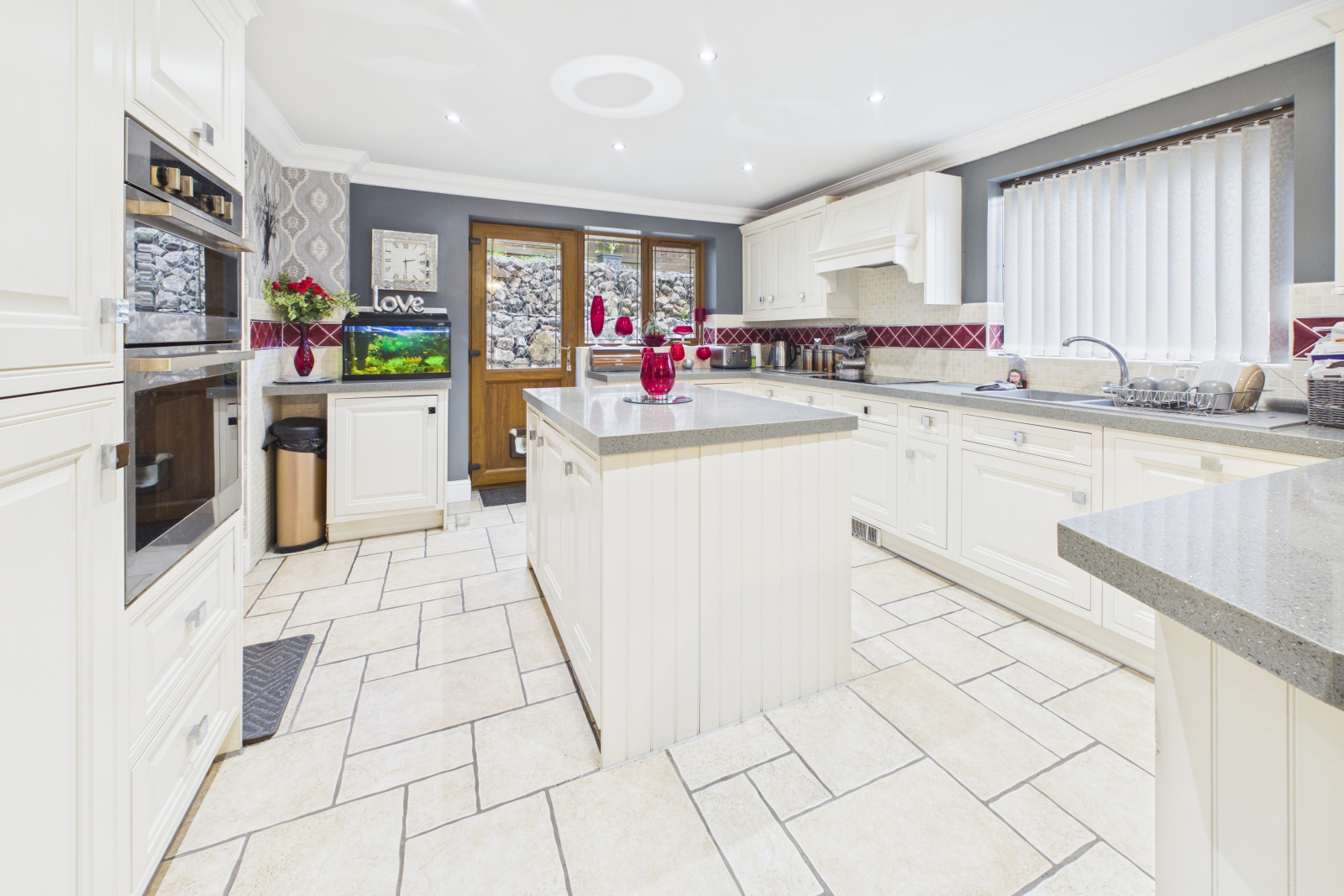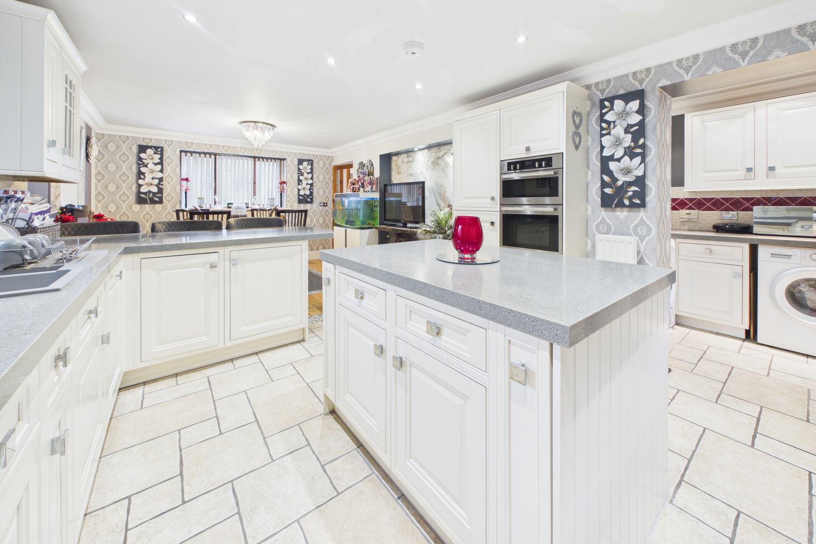 Kitchen / Diner 24'3'' x 12'1'' This stunning, beautifully presented kitchen is the heart of the home. Featuring an extensive range of base and eye-level units with granite work surfaces and tiled splashbacks, it offers both style and functionality. A spacious breakfast bar is perfect for casual dining, while the impressive central island adds a true statement feature.