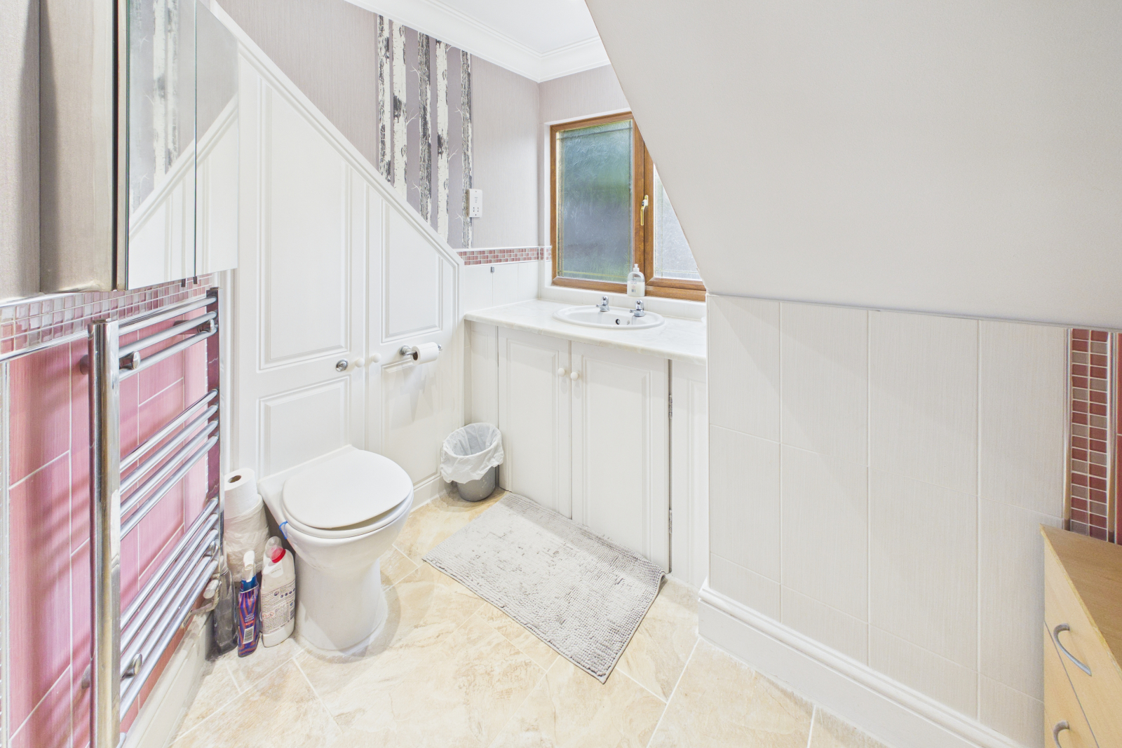 Downstairs Cloakroom 6'9'' x 4'7'' Tastefully finished with an obscured UPVC double-glazed window to the rear, half-tiled walls, and solid oak flooring. Comprising a low-level push-button WC, pedestal wash hand basin, spot lighting, chrome heated towel rail, and radiator.