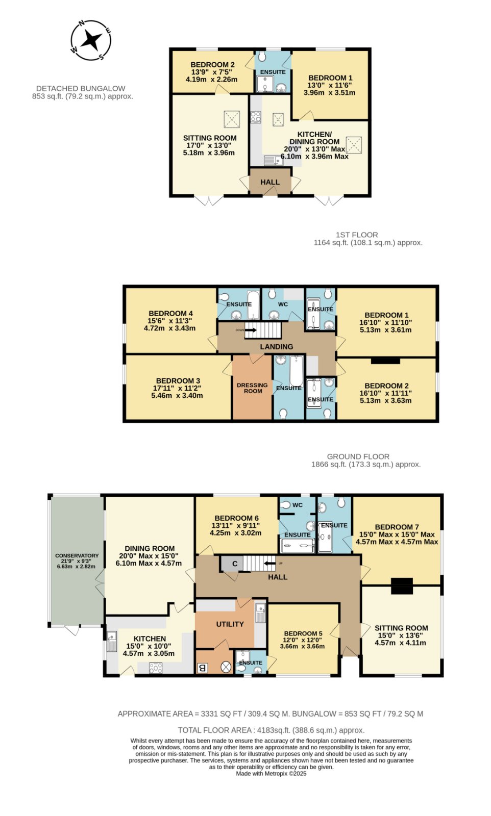 - Includes a substantial 7-bed main house (over 3,300 sq.ft.) and a detached 2-bed bungalow (over 850 sq.ft.)