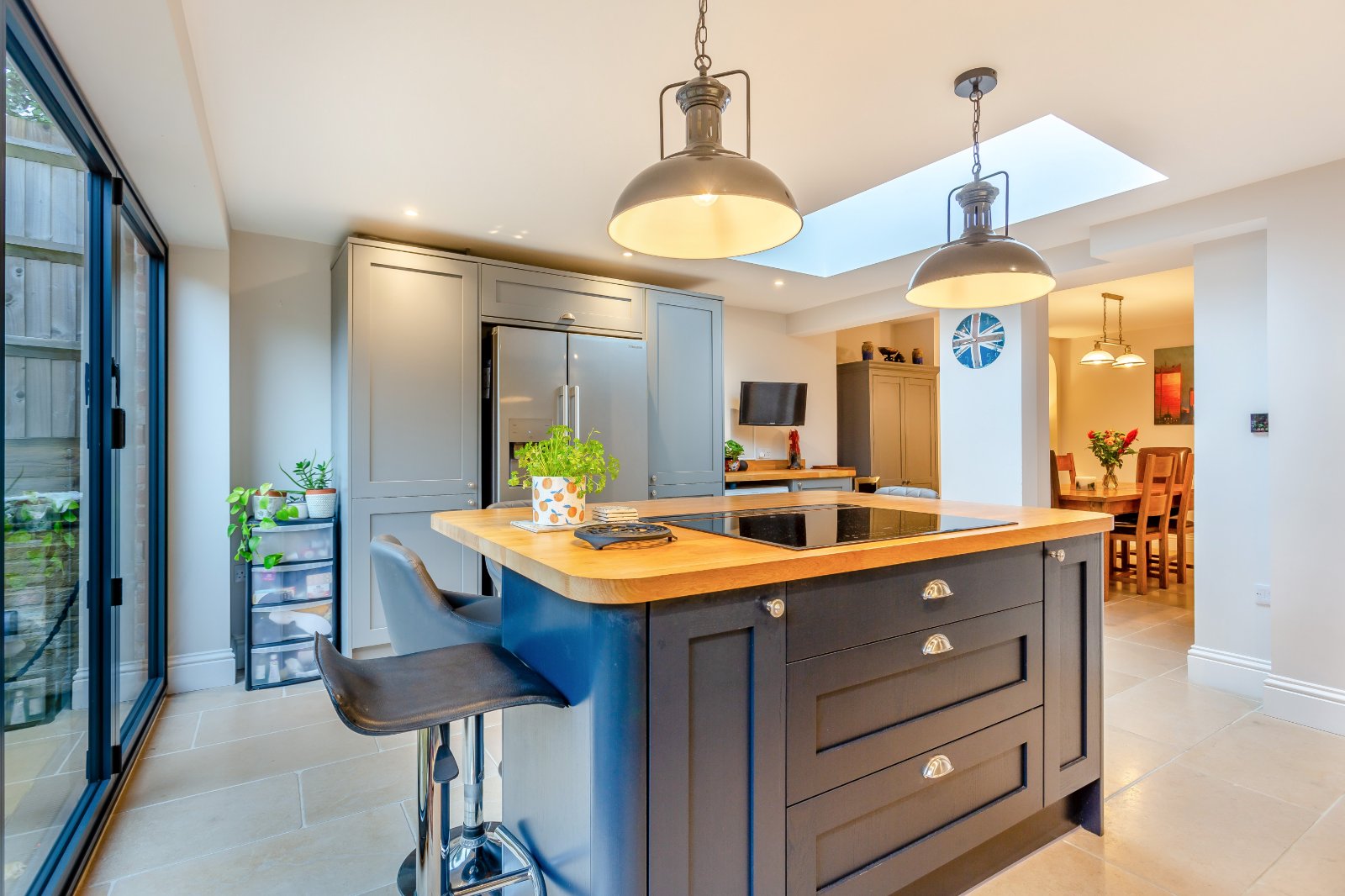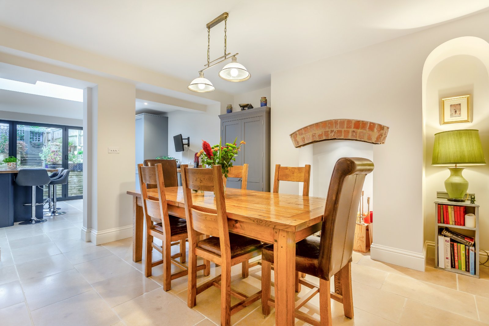 The property has been thoughtfully extended to create a fabulous kitchen-diner, the true hub of the home. The kitchen includes a central island with a hob and a sleek central downdraft extractor fan, along with an overhead light box. It also offers ample wall and base-mounted storage units with integrated Neff appliances. Bi-folding doors open onto the garden, flooding the space with natural light. The ground floor kitchen-diner also benefits from zoned underfloor heating, ensuring year-round comfort.
