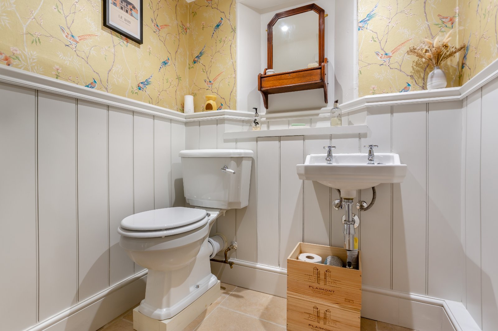 Upon entering, the welcoming entrance hall exudes a sense of grandeur, leading to a front sitting room that enjoys privacy from the sympathetically installed shutters. An essential downstairs cloakroom completes the ground floor.