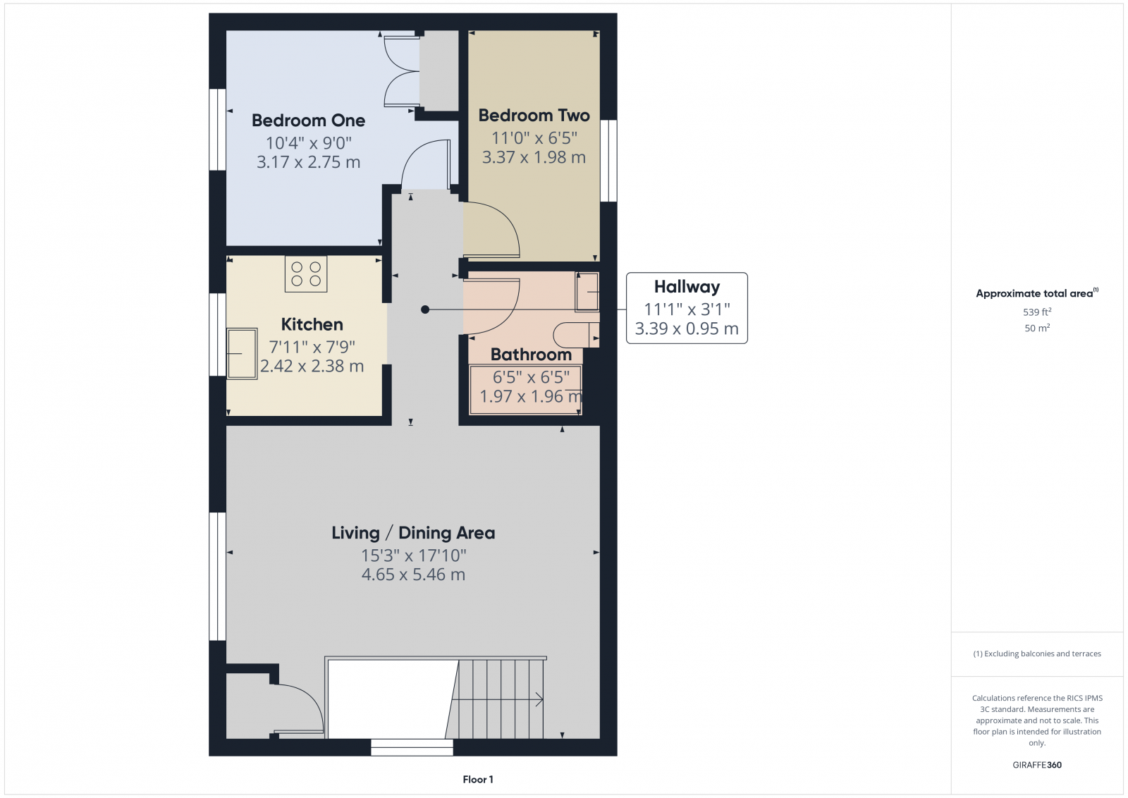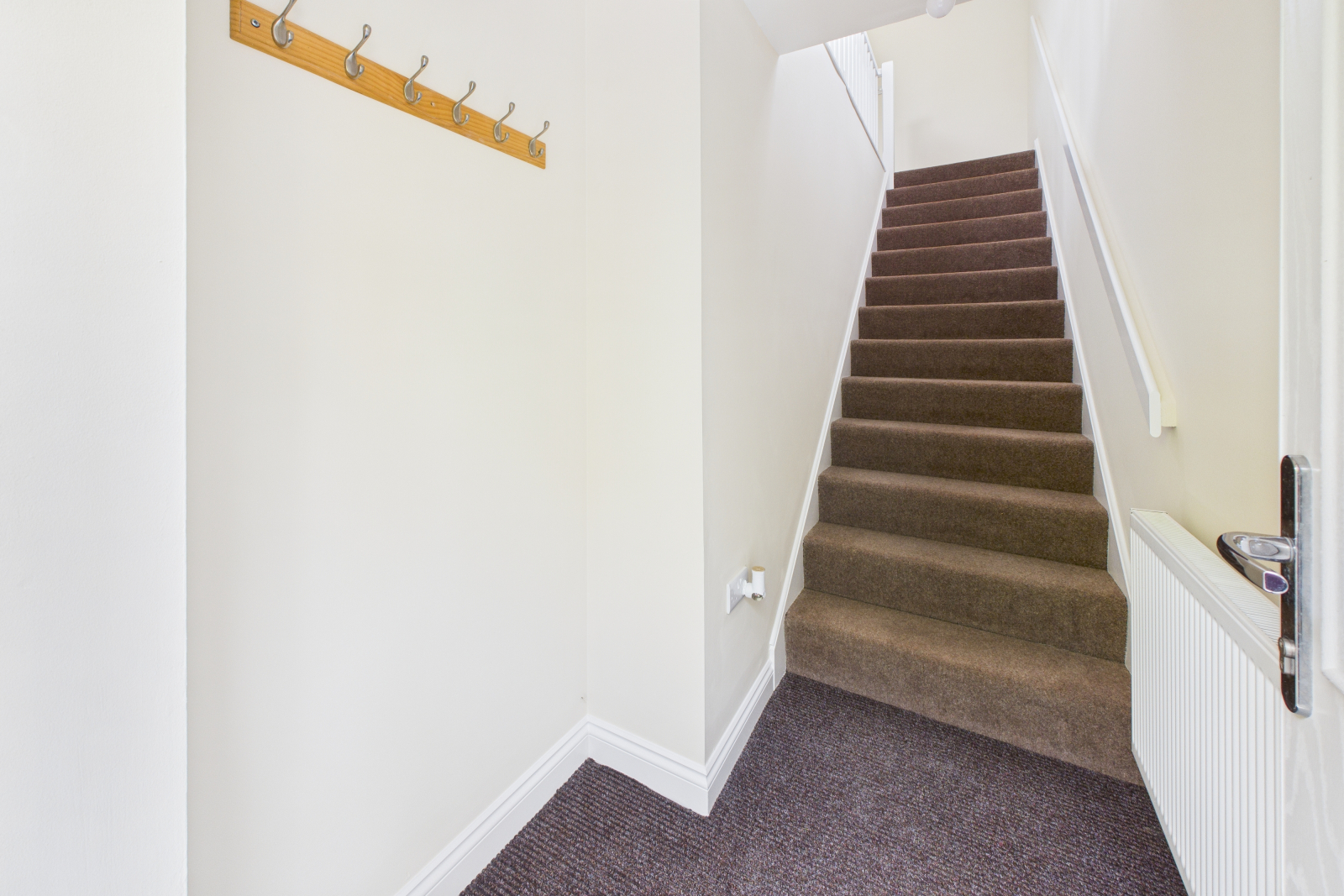 Hard-wearing carpet, composite front door, radiator, smoke alarm, carpeted stairs with wooden handrail.