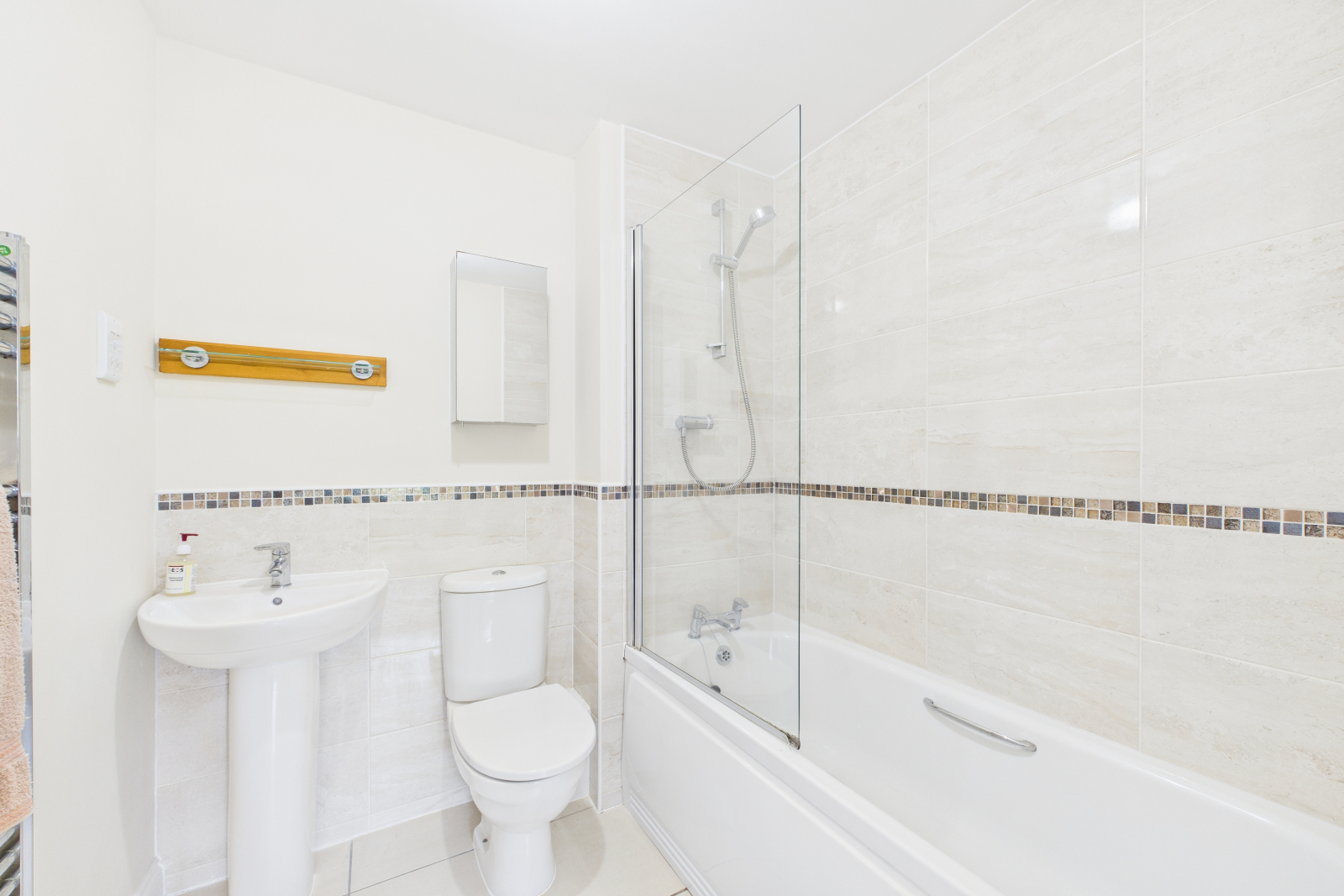 Tiled flooring and splashbacks, extractor fan, shaving point, pedestal wash hand basin with chrome mixer tap, low-level WC with push flush, bathtub with chrome tap and mounted mains shower, wall-mounted mirror cabinet.