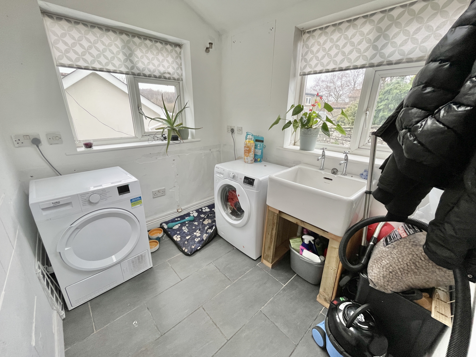 A modern extension to the original property this room is bright and airy with UPVC double-glazed windows to front and side elevations and Velux skylight. Tiled flooring throughout and space for washing machine and condenser dryer. Fitted Belfast sink and spot lighting. Power points and door to;