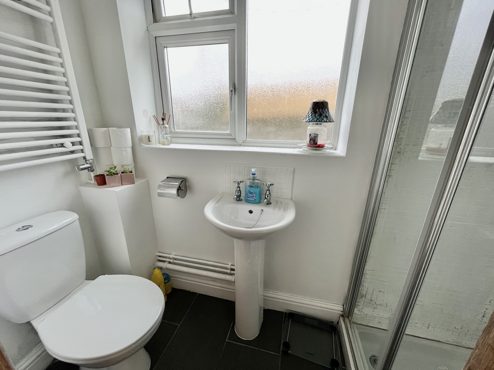 UPVC obscured double-glazed window to the front elevation. Low-level push button W.C and pedestal wash hand basin with tiled splash backs. Step in shower cubicle with power shower and attachments. Modern heated towel rail and tiled flooring.