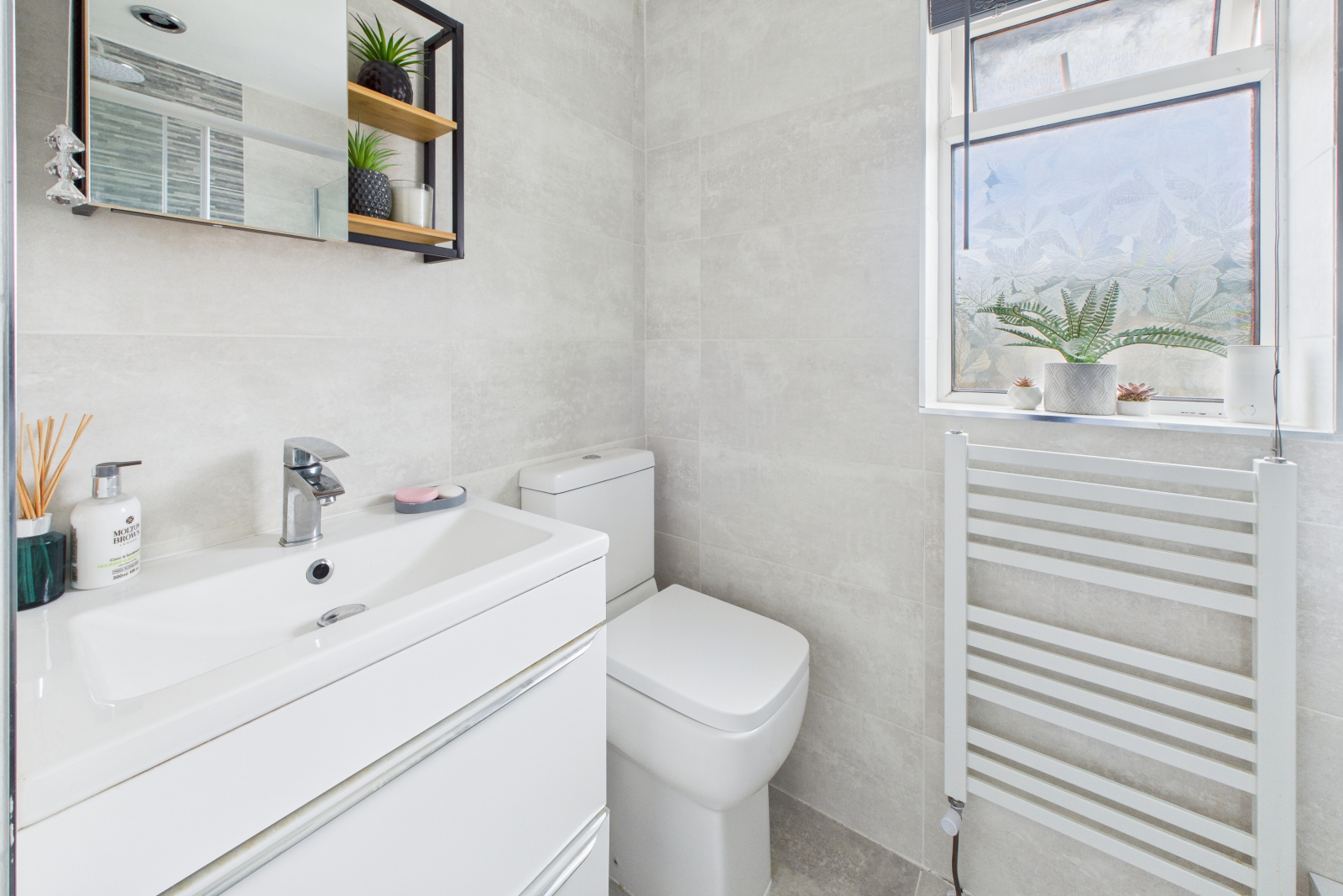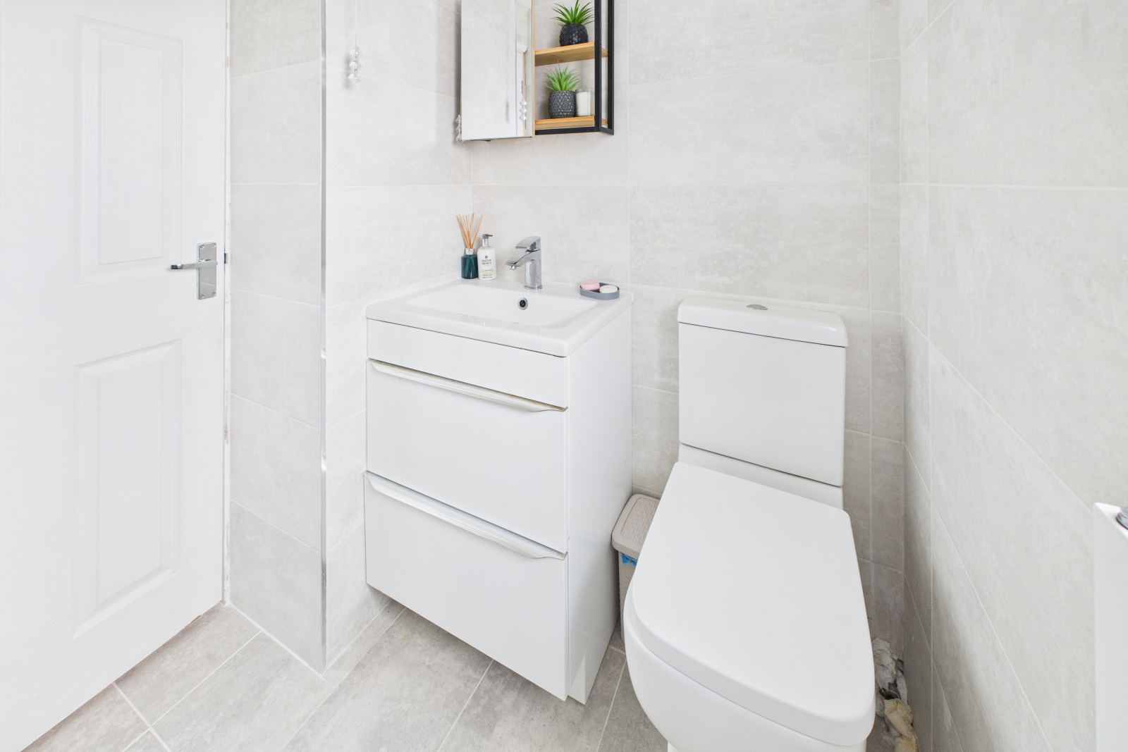Shower Room 5'5'' x 6'7'' Obscured UPVC double-glazed window to the rear aspect. Recently modernised and beautifully presented. Fully tiled with a low-level push-button W.C. and integrated wash hand basin with mixer tap. Double step-in shower with glazed sliding door and Mira Sport shower with attachments. Heated towel rail, ceiling lighting, and extractor fan.
