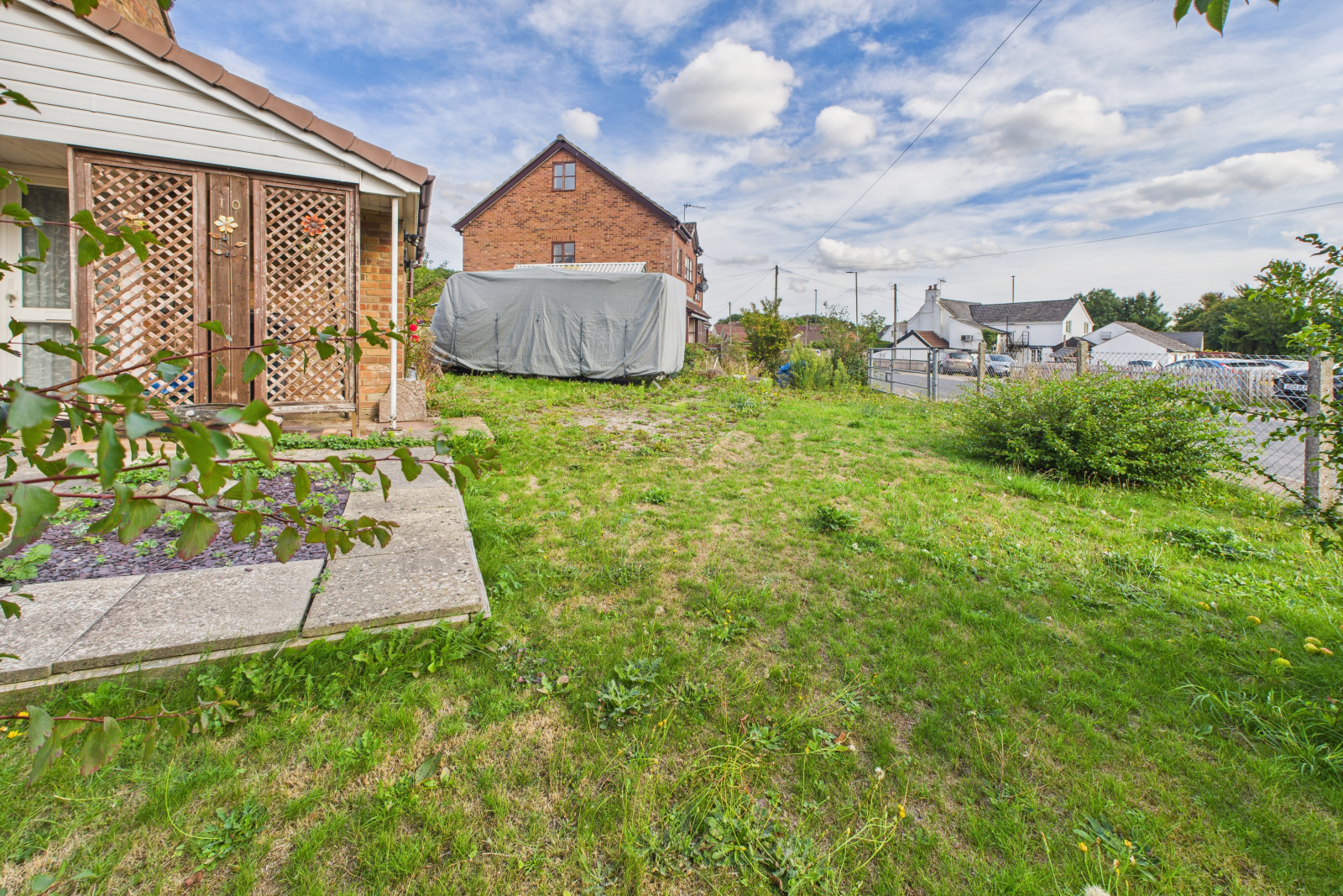 To the side of the property, an open paved seating area leads to a larger lawned space. A block-paved driveway provides ample off-road parking and is accessed via double gates. A paved path continues around to a secure gate into the rear garden.