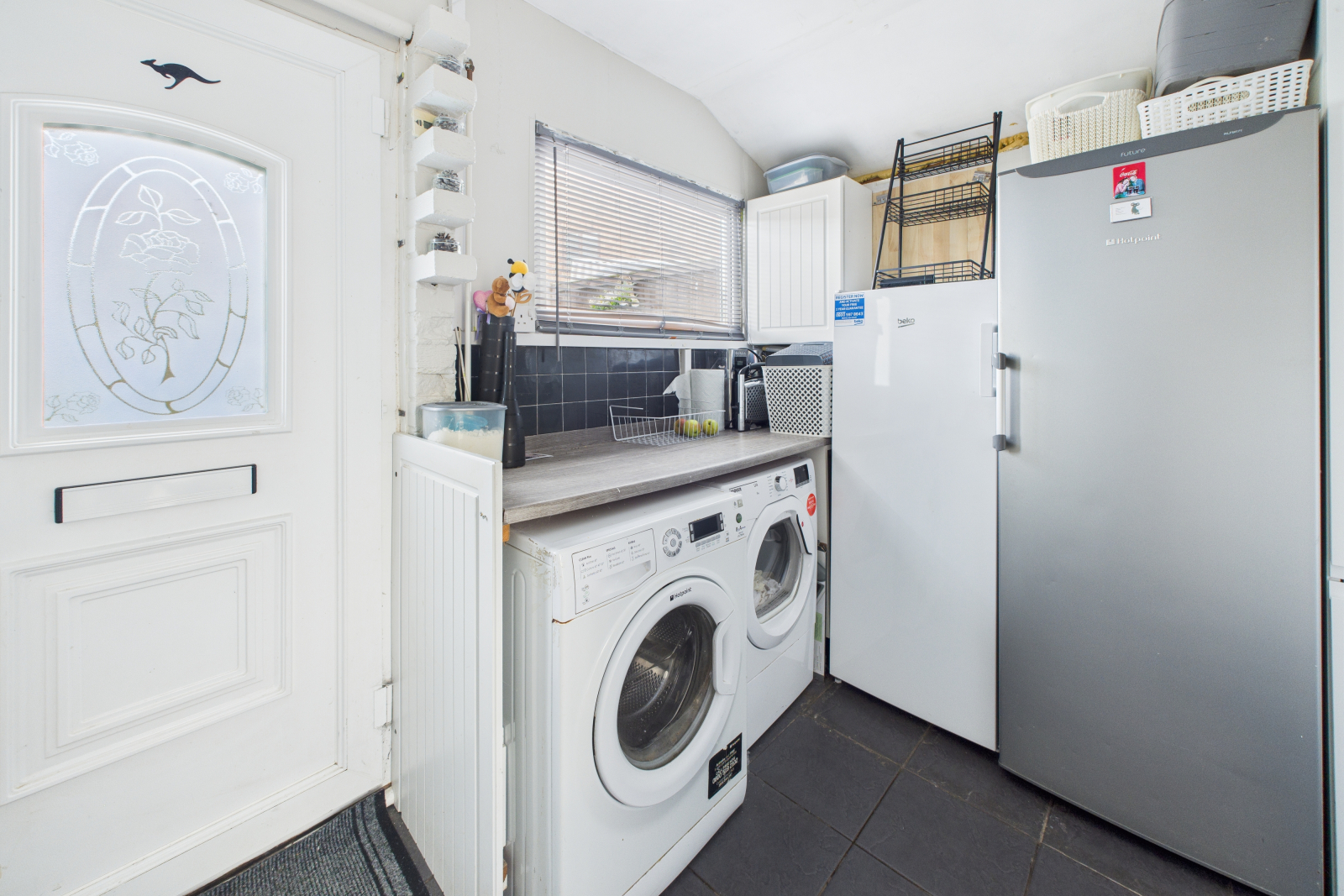 Utility Room 7'6'' x 9'4'' UPVC double-glazed window to the rear aspect and an obscured double-glazed door providing access to the garden. Tiled flooring and ceiling lighting. Fitted work surfaces with tiled splashbacks. Space and plumbing for a washing machine and tumble dryer. Additional space for a fridge and freezer. Range of fitted cupboards.