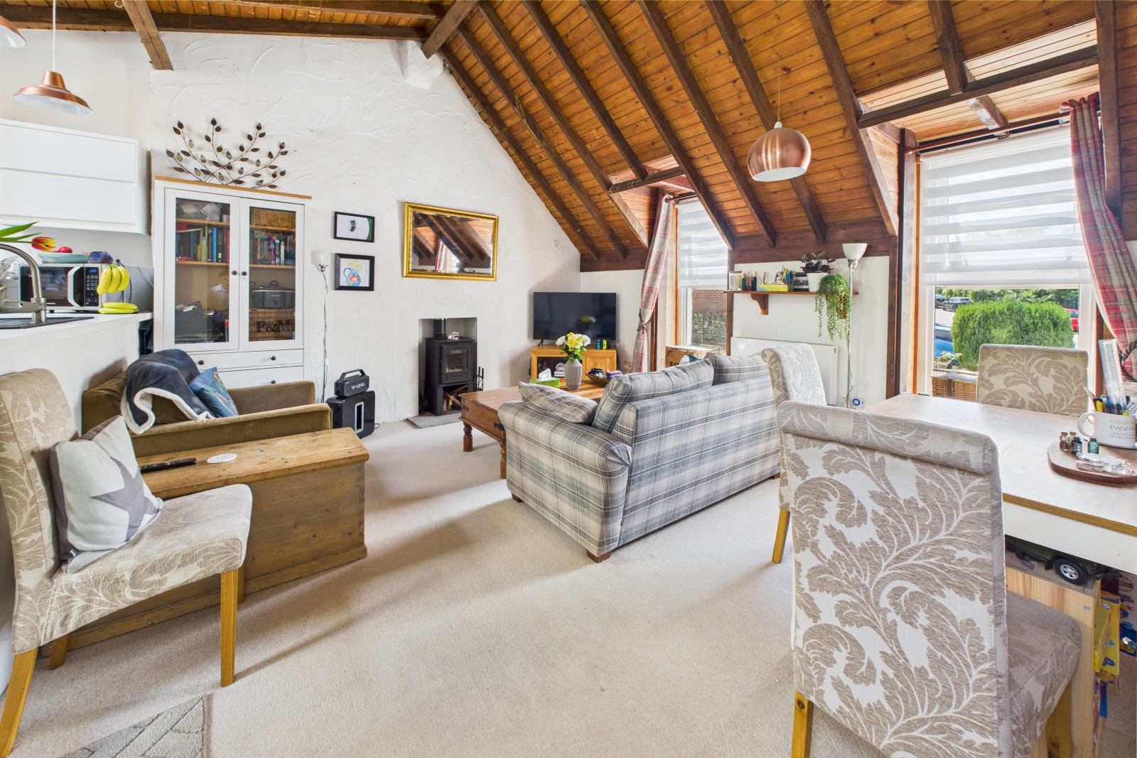 - Open Plan Living – Vaulted ceilings, wood burner, and lots of light