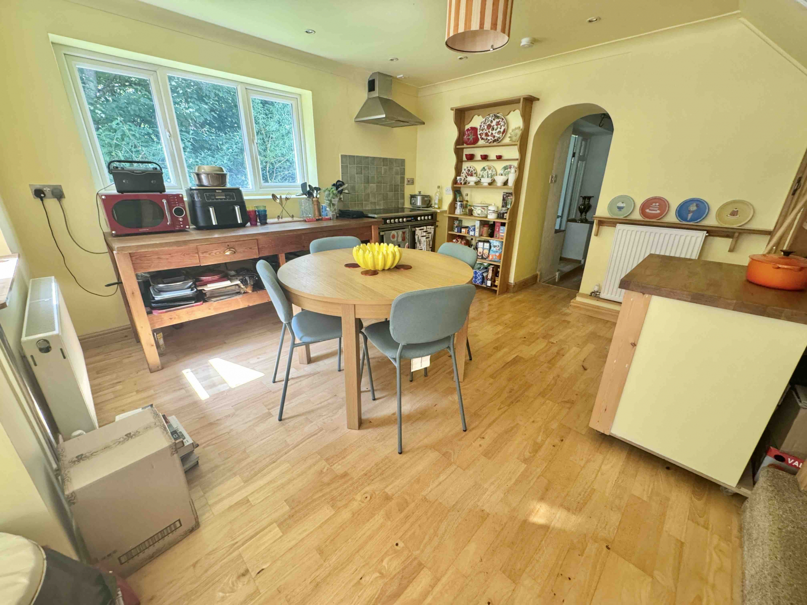 Thoughtfully extended and beautifully finished, this stunning kitchen/diner boasts a vaulted ceiling with skylights and an array of UPVC double-glazed windows that flood the room with natural light and woodland scenery. The perfect setting for entertaining, it features a range of fitted base and wall units, wooden worktops, tiled splashbacks, and a charming Belfast sink. There’s space and plumbing for a washing machine and dishwasher, a large range-style oven with chimney extractor, and room for a full-size fridge/freezer. The area also includes under-stair storage, feature lighting, and wood-effect flooring. An archway leads through to: