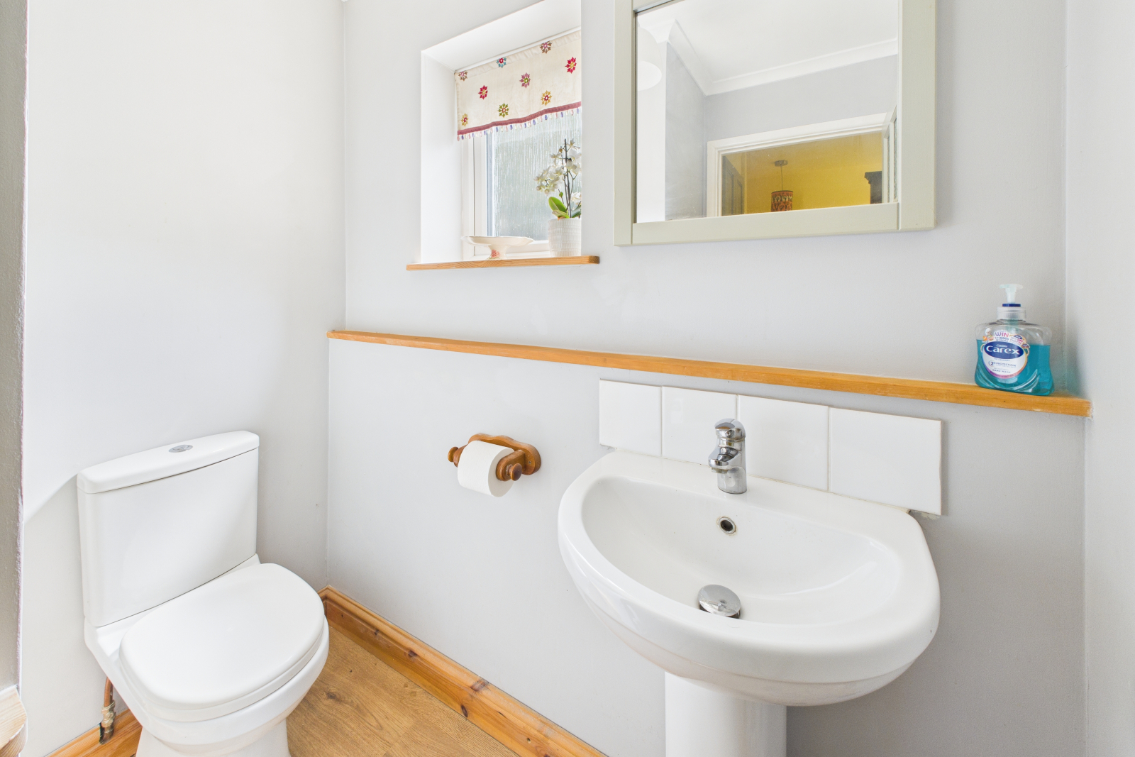 Enjoy woodland views from two rear-facing UPVC double-glazed windows. This well-appointed shower room includes a low-level W.C., pedestal wash basin with mixer tap, and a step-in power shower with aqua splashback borders. Additional features include fitted storage, a chrome-effect heated towel rail, tile-effect flooring, and loft access.