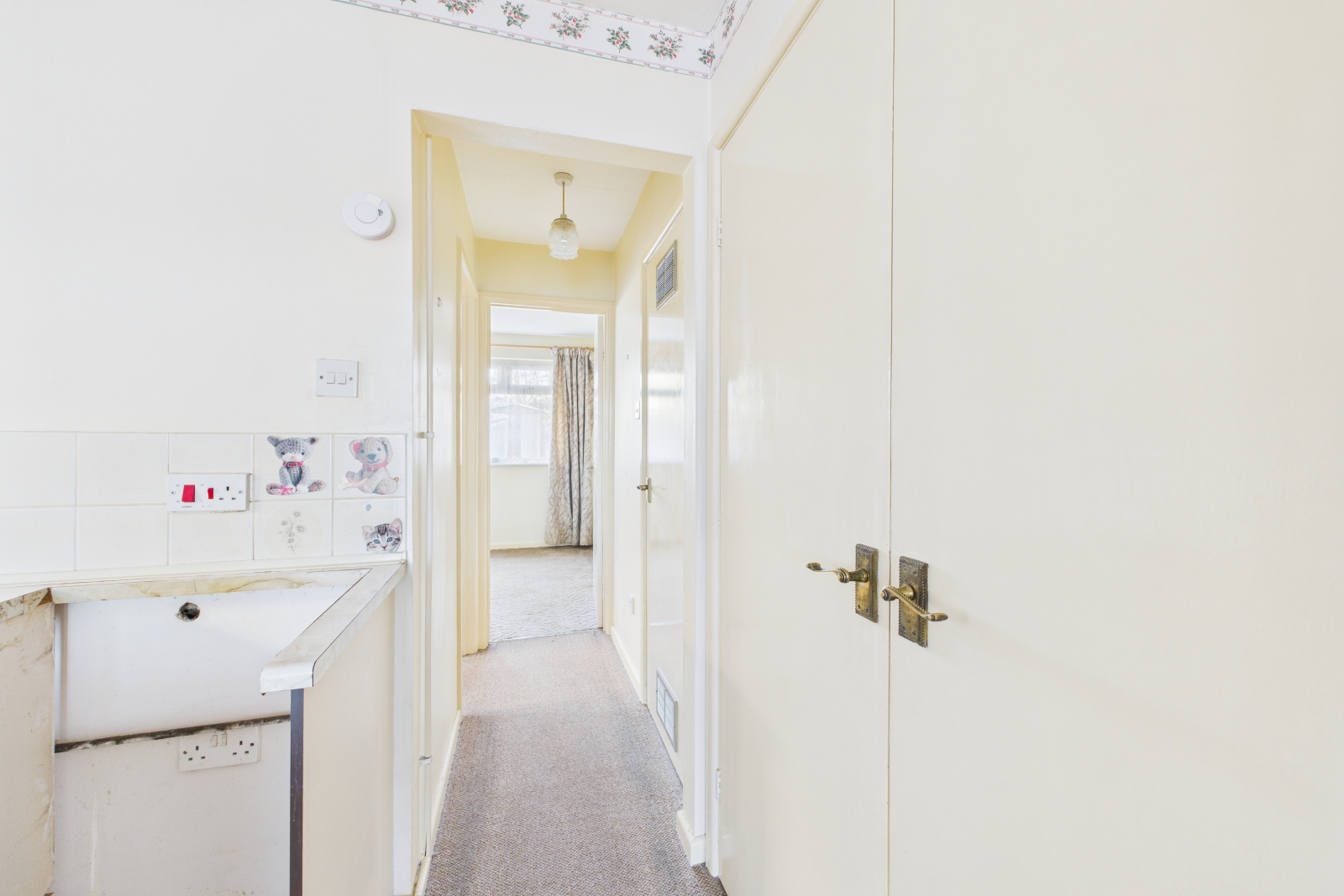 Carpet flooring, UPVC double-glazed window to front aspect, radiator, gas fireplace, TV aerial point, power points, base units with marble-effect worktop, washing-up sink with drainer and hot and cold taps, boiler location, power points, space for oven, fridge/freezer and washing machine, storage cupboard, UPVC double-glazed door to side aspect leading to side access.