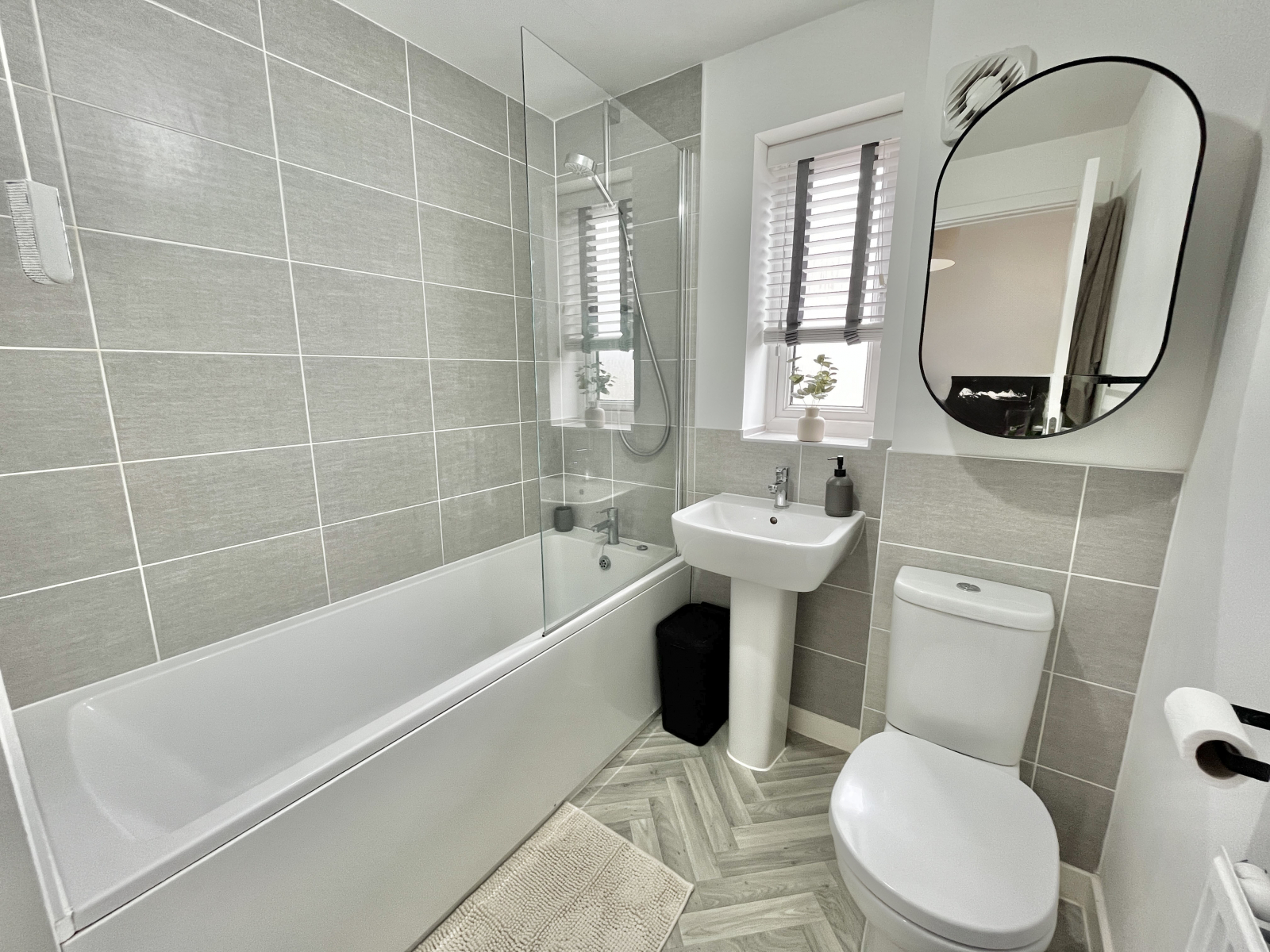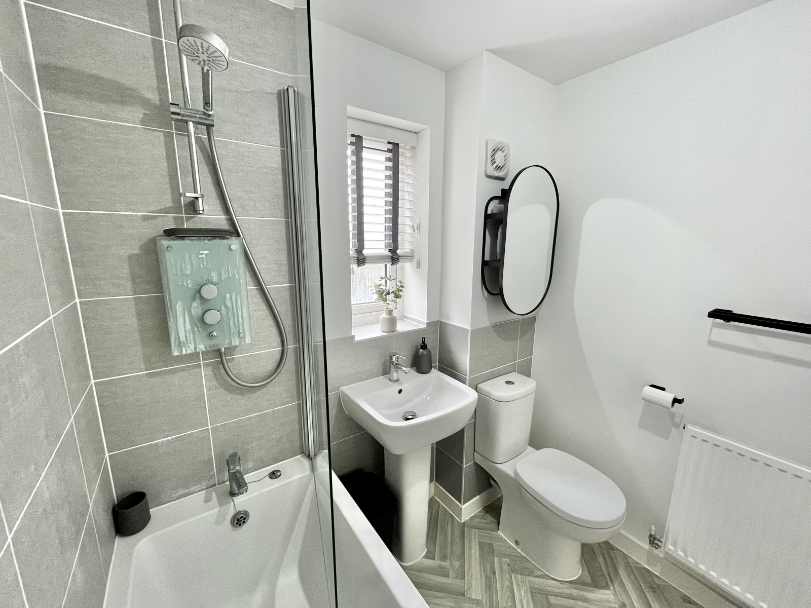 UPVC obscured double-glazed window to the side elevation. White suite comprising of low-level push button W.C and pedestal wash hand basin with mixer taps over. Panel bath with mixer tap and shower. Tiled splash backs and central lighting. Extractor fan. Wood effect vinyl flooring throughout and radiator.