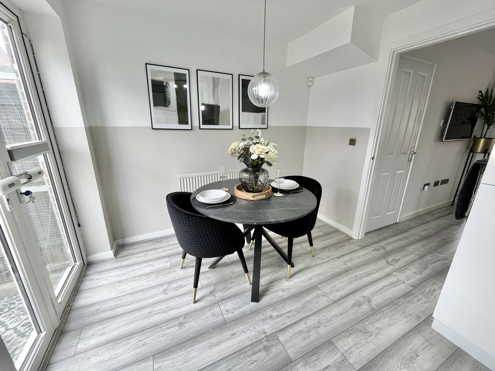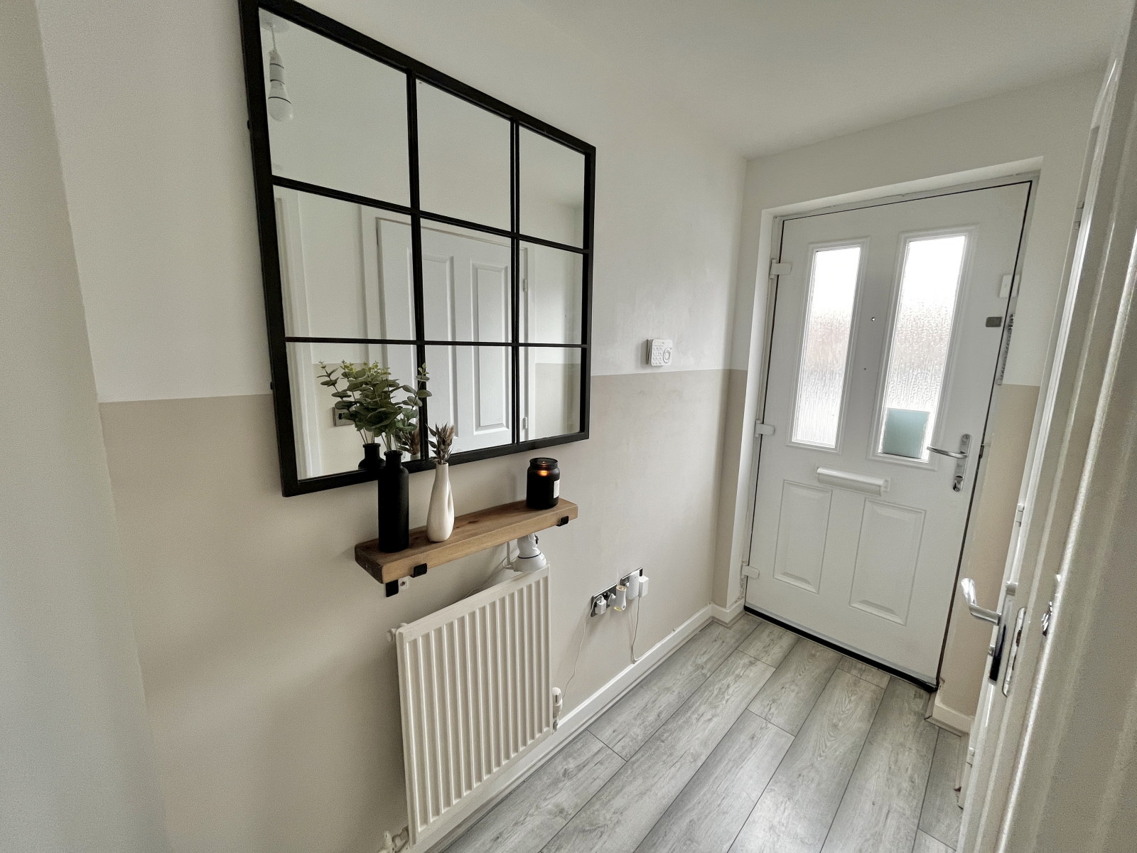 Bright entrance hallway with wood effect flooring. Radiator and chrome effect power points. Pendant light and chrome effect light switches. Stairwell to the first floor.