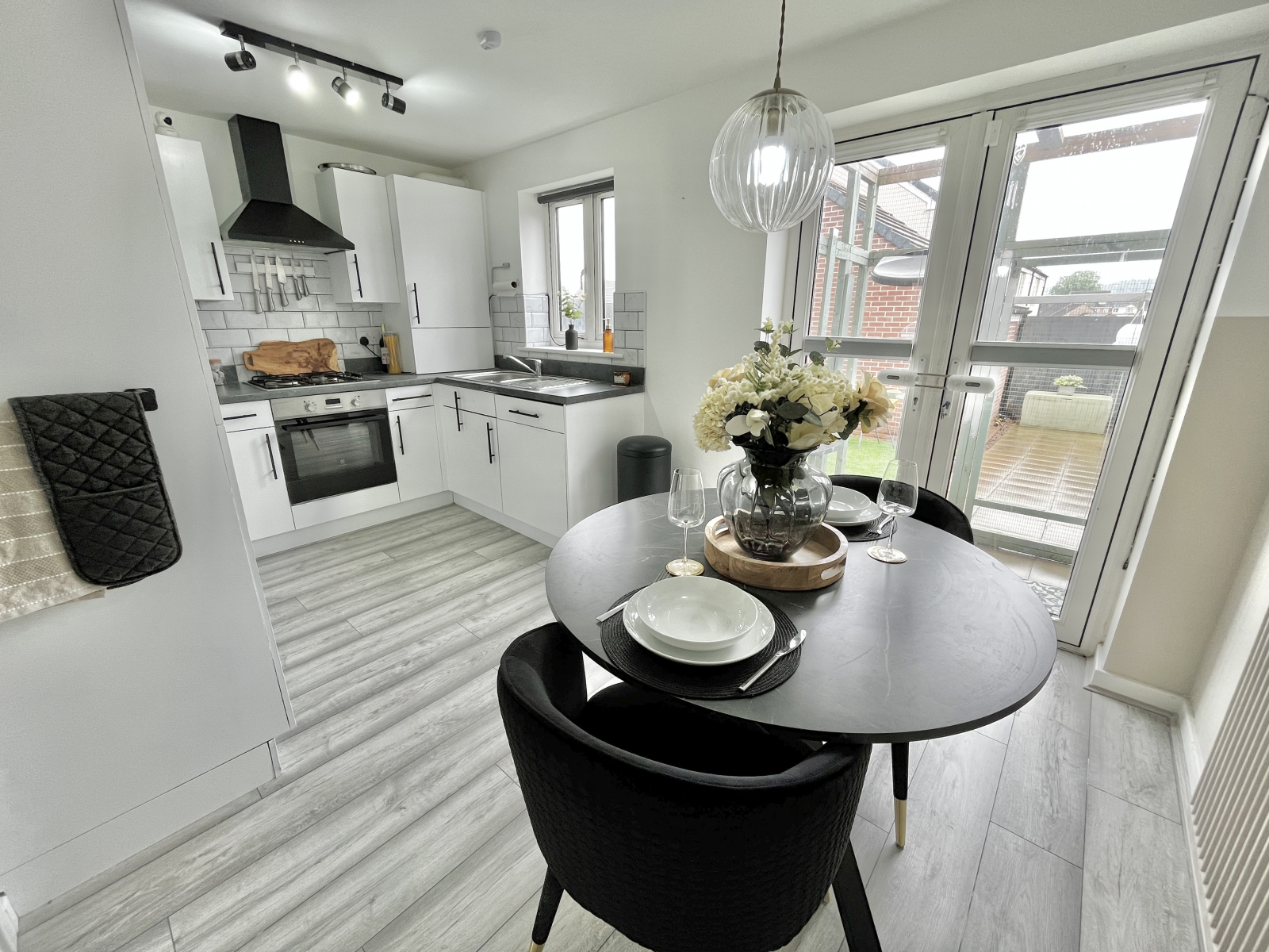 UPVC double-glazed patio doors giving access to the garden and UPVC double-glazed window to rear aspect. Wood effect flooring throughout and two feature ceiling lights. Fitted kitchen with a range of base and eye level fitted units and drawers. Integrated fridge/ freezer, washing machine and dishwasher. Electric oven and Four-ring gas hob with extractor above. White metro effect tiled splash backs and Stainless steel sink and drainer with mixer tap. The dining area has radiator and space for dining table, power points and light switches.