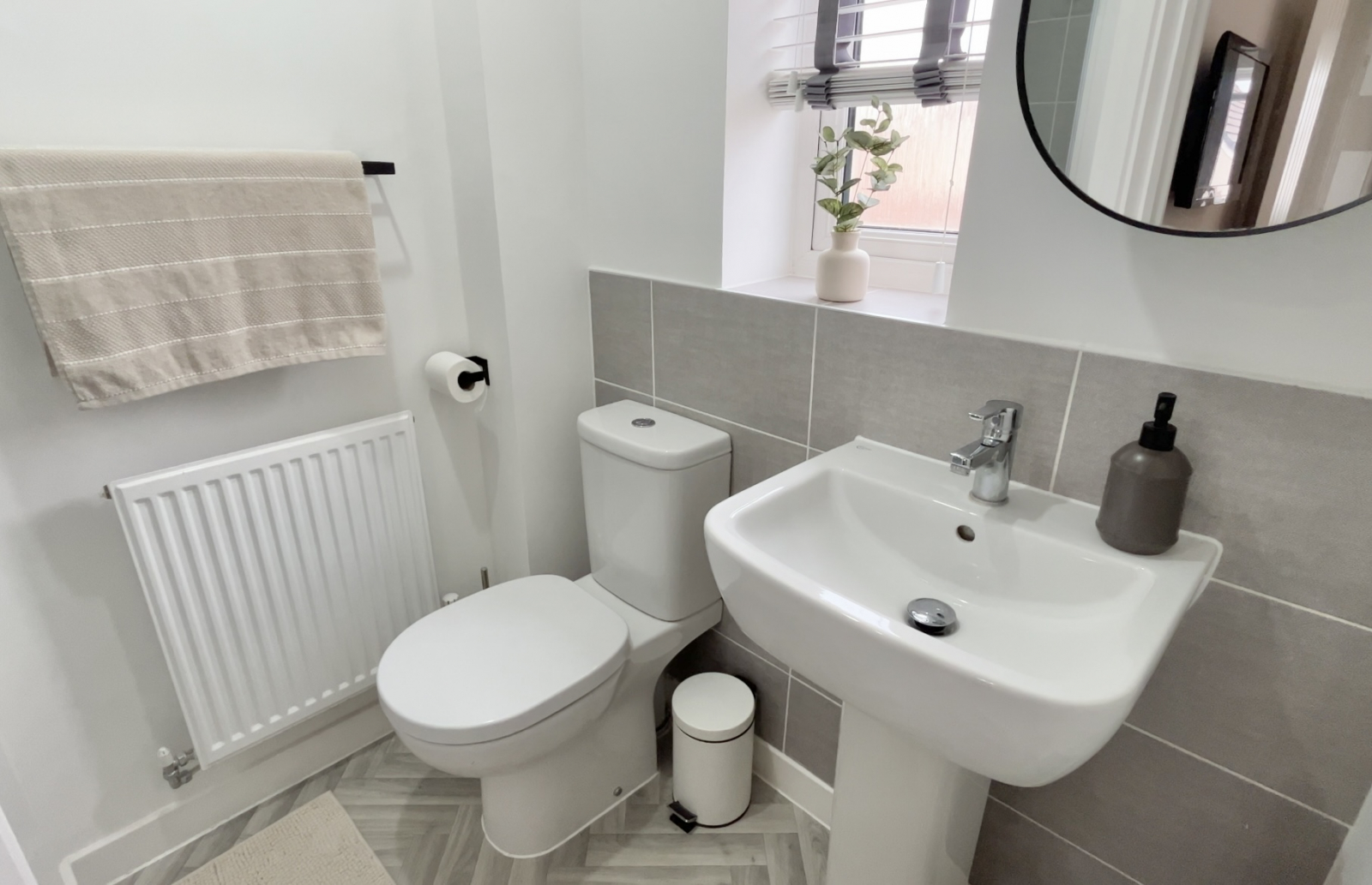 Obscured UPVC double-glazed window to front elevation. White suite comprising of low-level push button W.C and pedestal wash hand basin with mixer tap and splash back. Wood effect flooring and radiator. Central lighting.