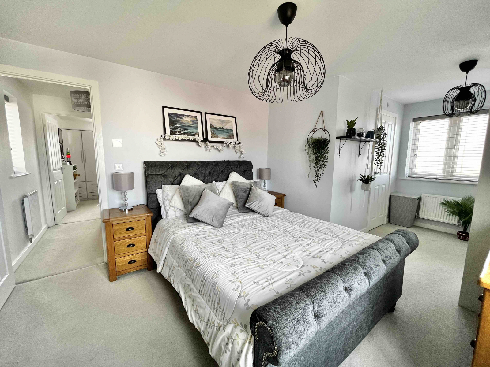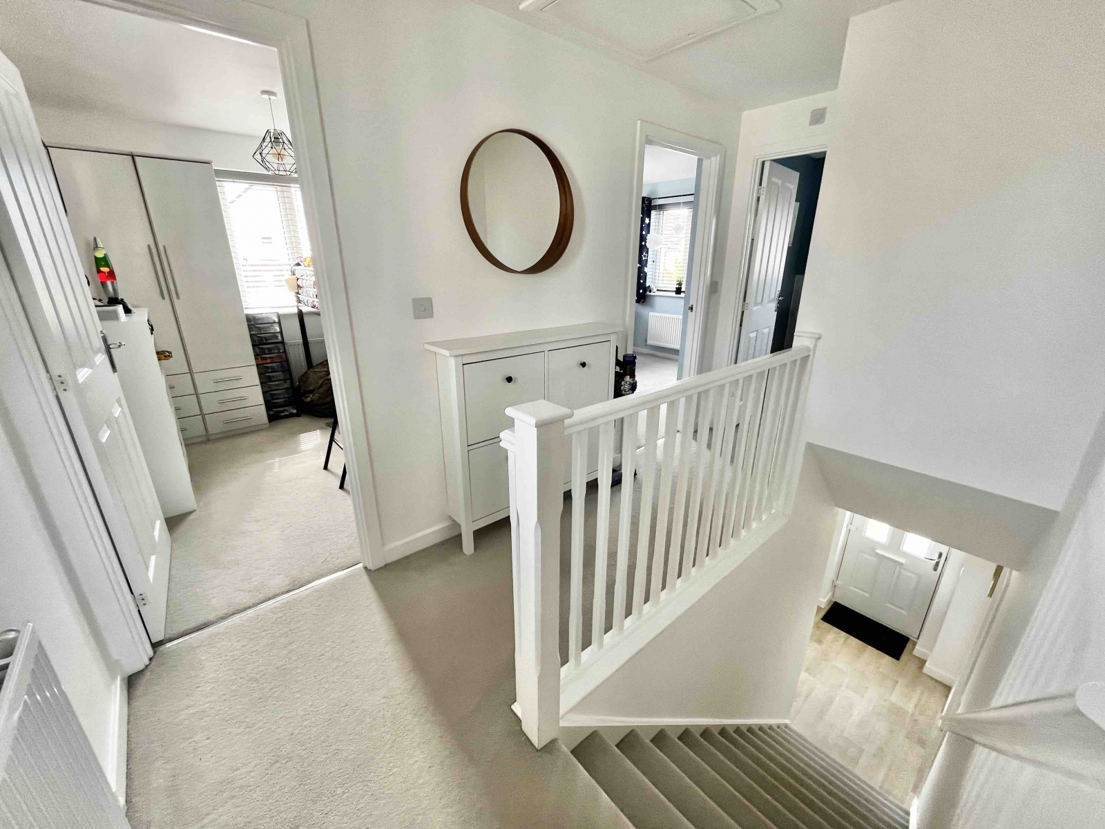 First Floor Landing UPVC double-glazed window to rear elevation with radiator under. Carpeted galleried style landing with doors leading off. Loft access and storage cupboard with shelving. Pendant central lighting.