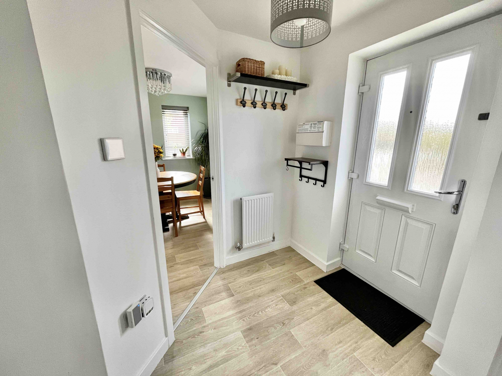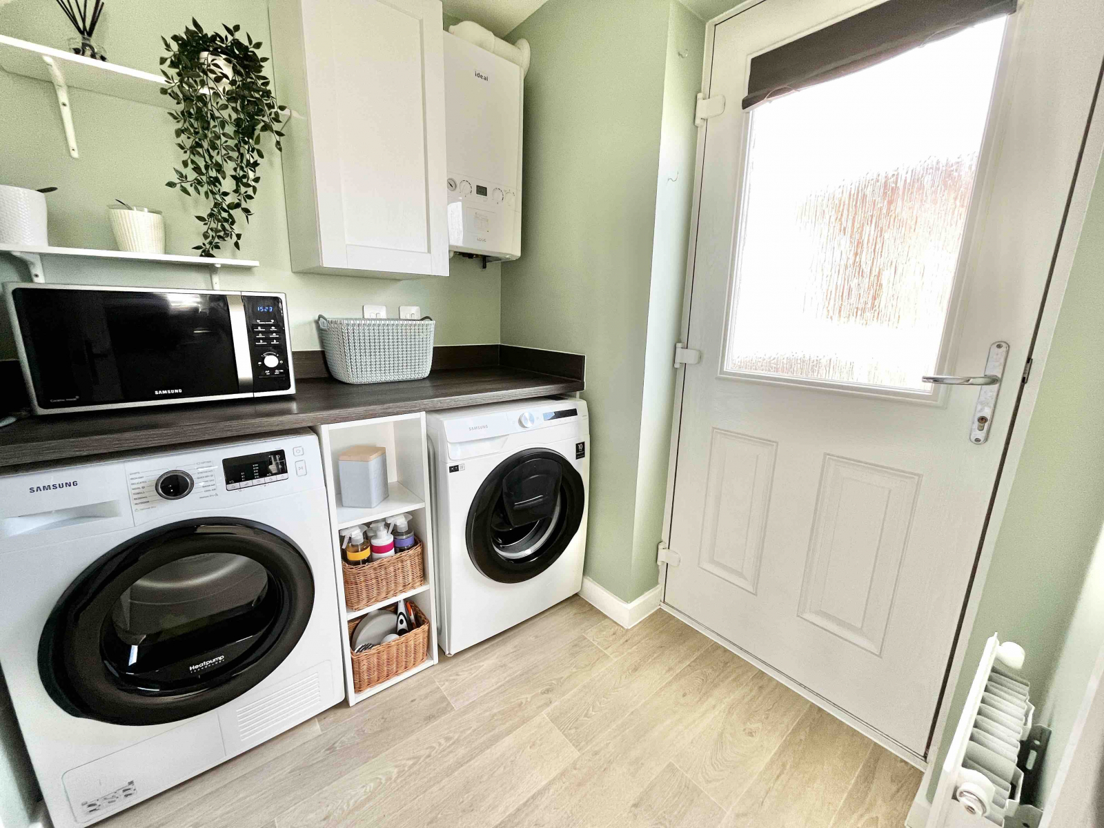 Half obscured glazed door to rear. Worksurfaces with space for under-counter washing machine and tumble dryer. Wood effect vinyl flooring. Central lighting and under-stairs storage area. Power points and radiator. Wall-mounted Gas central heating boiler. Door to;