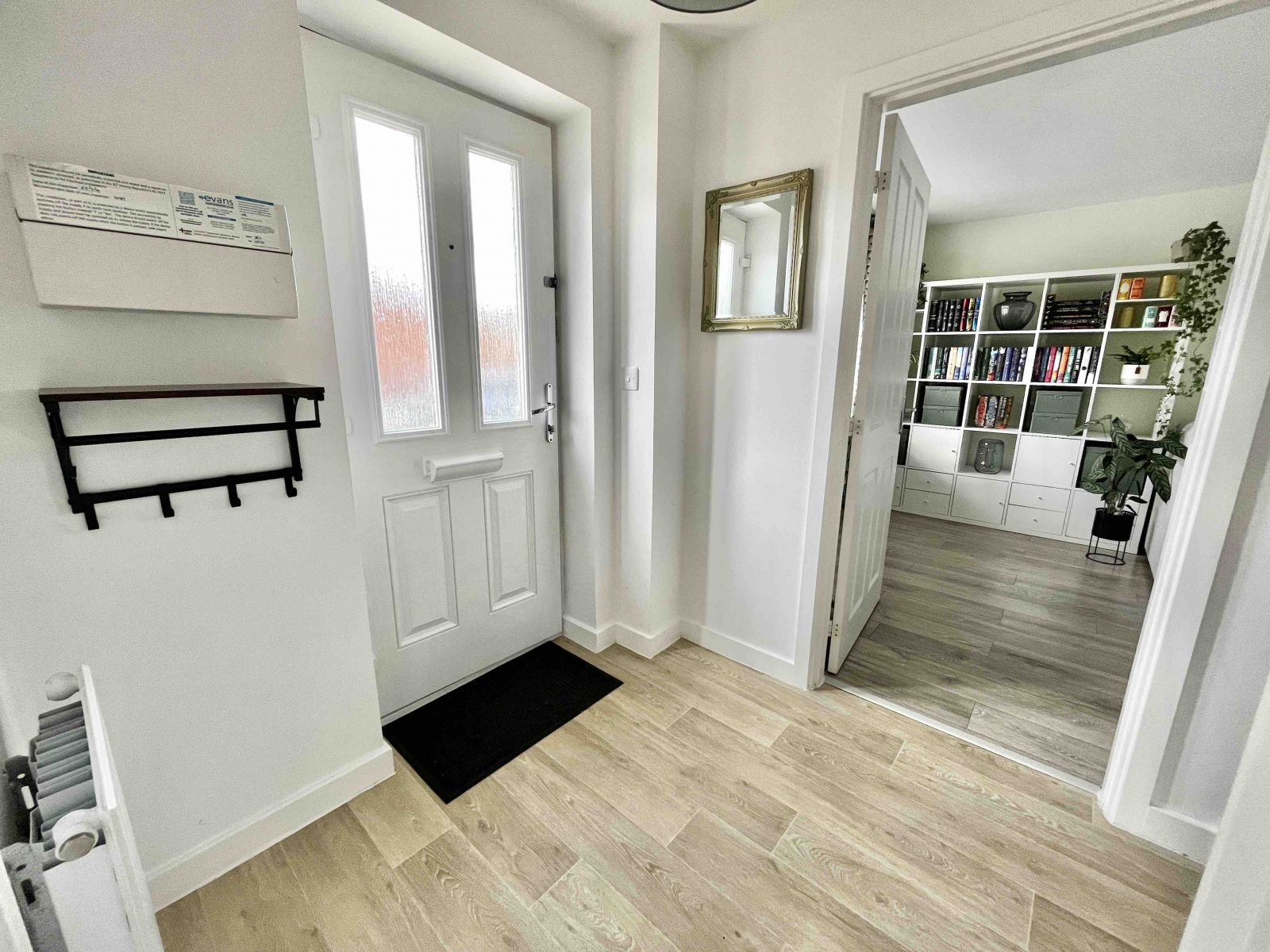 Entrance via obscured glazed paneled entrance door. Wood effect vinyl flooring throughout and open carpeted stairwell to the first floor. Central pendant lighting and radiator. Power points and doors leading off.
