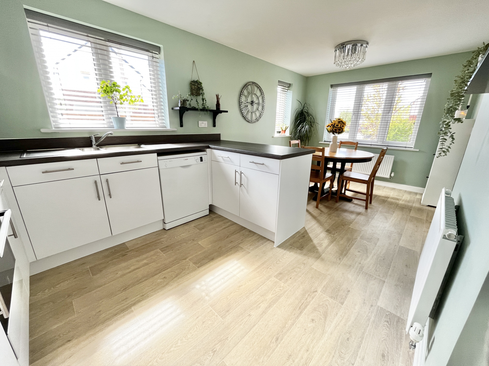 UPVC double-glazed windows to front and side elevations. The kitchen has a beautiful range of white units and drawers with dark wood effect work surfaces and matching upstands. Space for dishwasher and fridge/freezer. Integrated electric oven with splash back and integrated extractor above. Four ring gas hob. Wood effect vinyl flooring throughout and 1 1/2 bowl stainless steel sink with drainer and mixer tap. Feature lighting, power points, and space for a dining table. Two radiators and storage cupboard and door to;