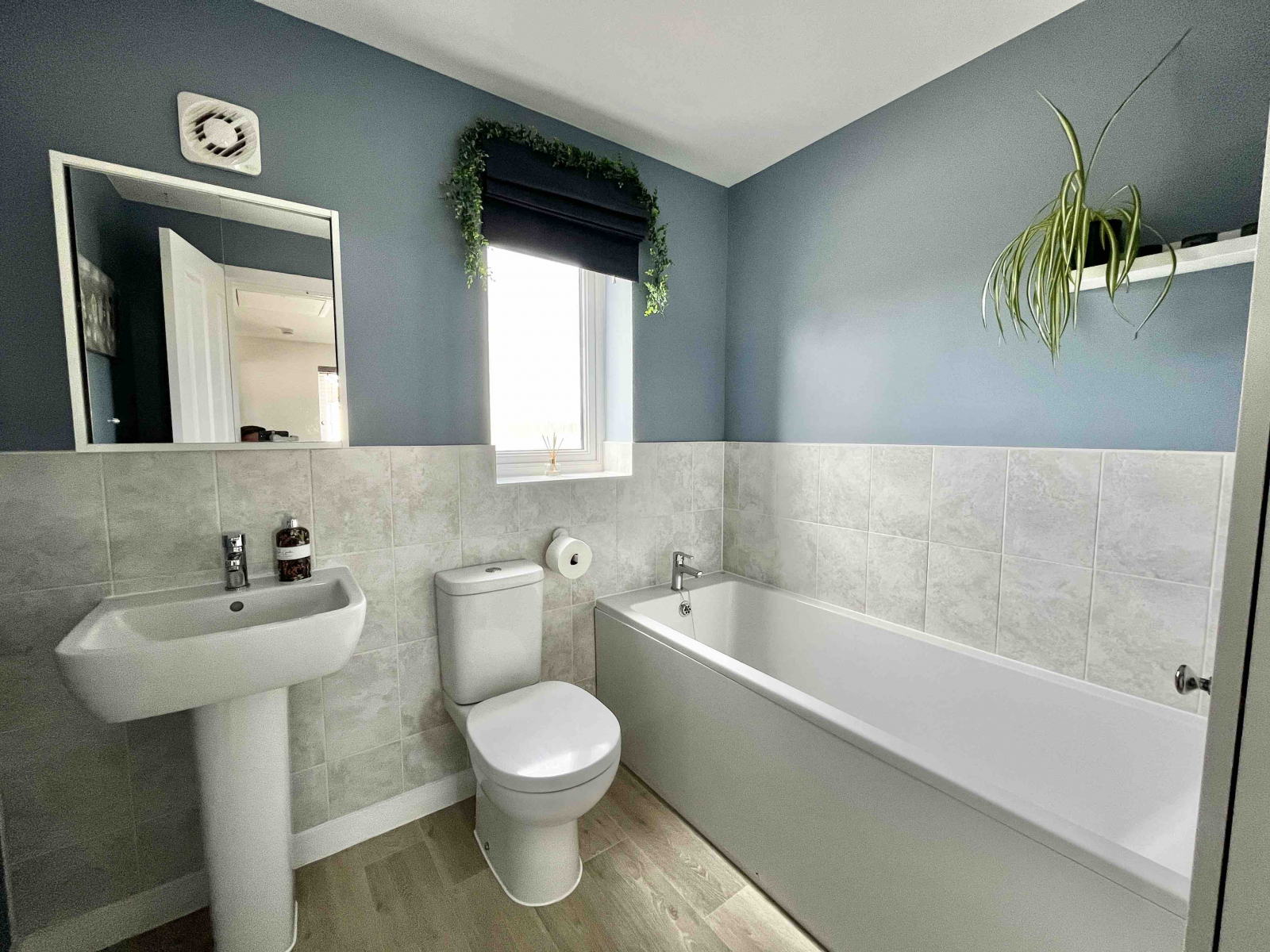 Obscured UPVC double-glazed window to front elevation. White suite comprising of low-level push button W.C. and pedestal wash hand basin with mixer tap. Panel bath with mixer tap and tiled splash backs. Vinyl flooring and radiator. Central lighting and extractor fan.